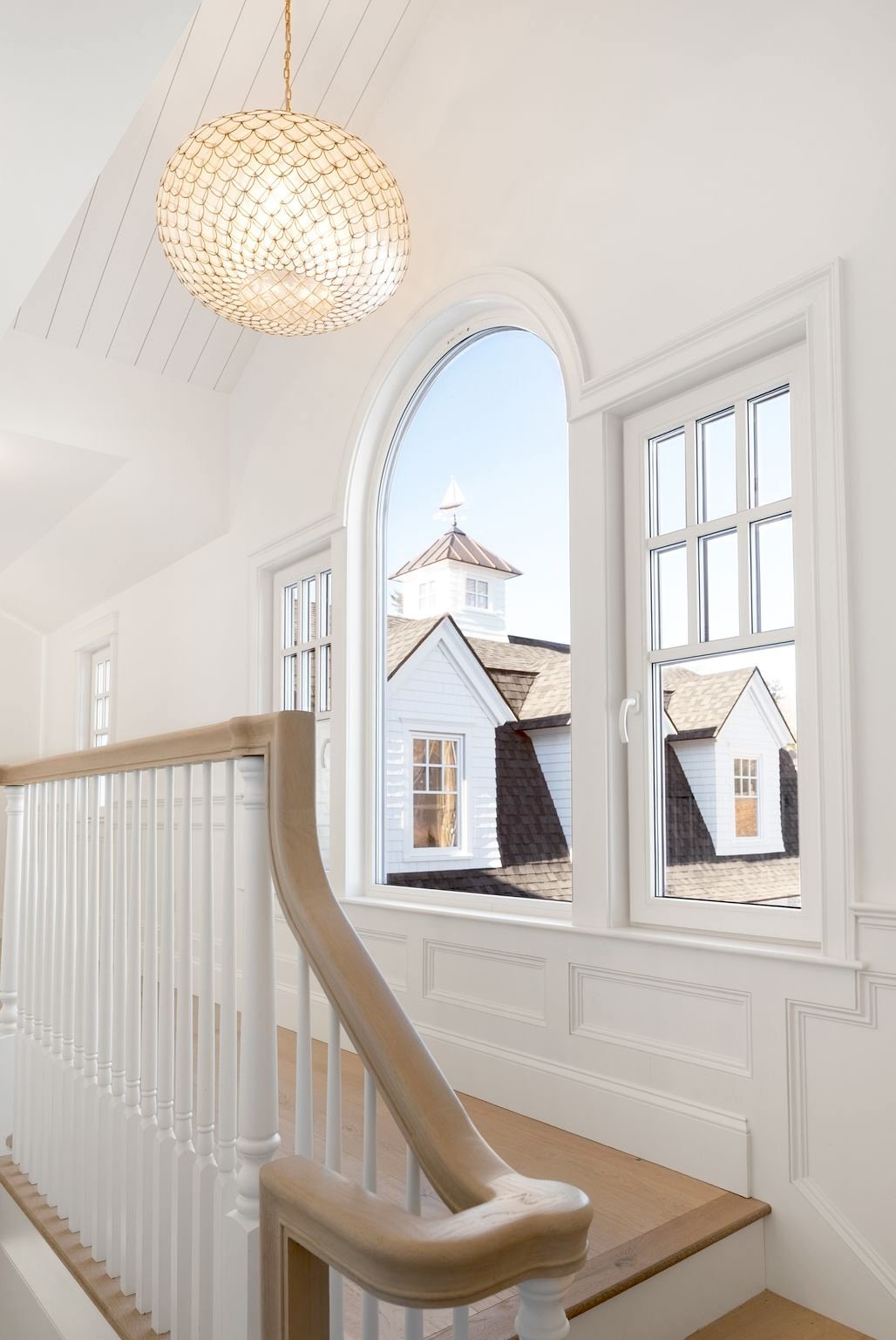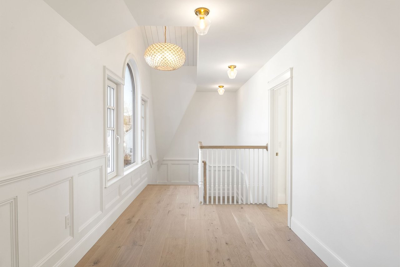 Upstairs, three beautifully appointed ensuite bedrooms offer refined accommodations for family and guests. Tucked just beyond them, a separate vaulted living room rises beneath exposed beams, an extraordinary space where light streams through classic dormers and a circular porthole-like window perfectly frames views of the yacht club. Above, an airy cupola crowns the room, filling the space with shifting daylight and sky.