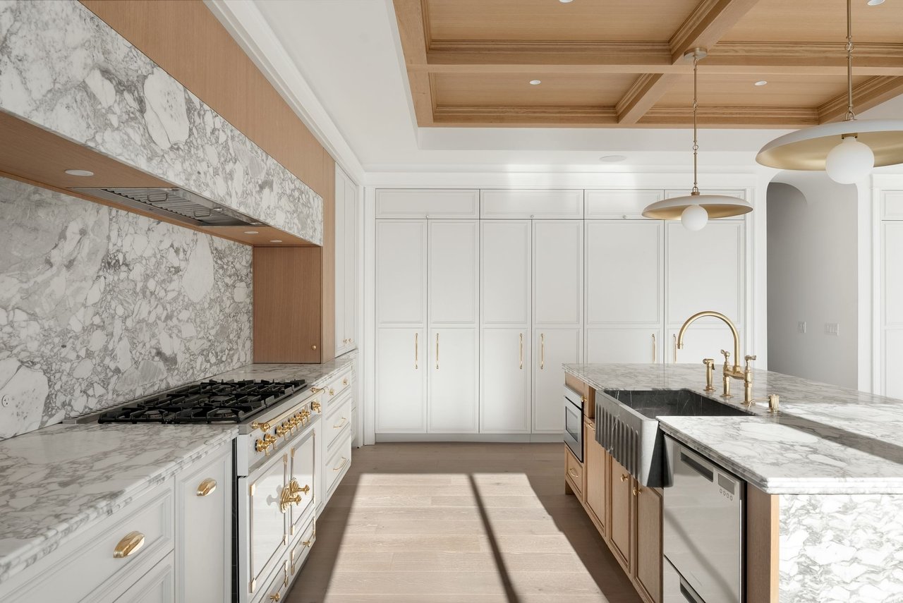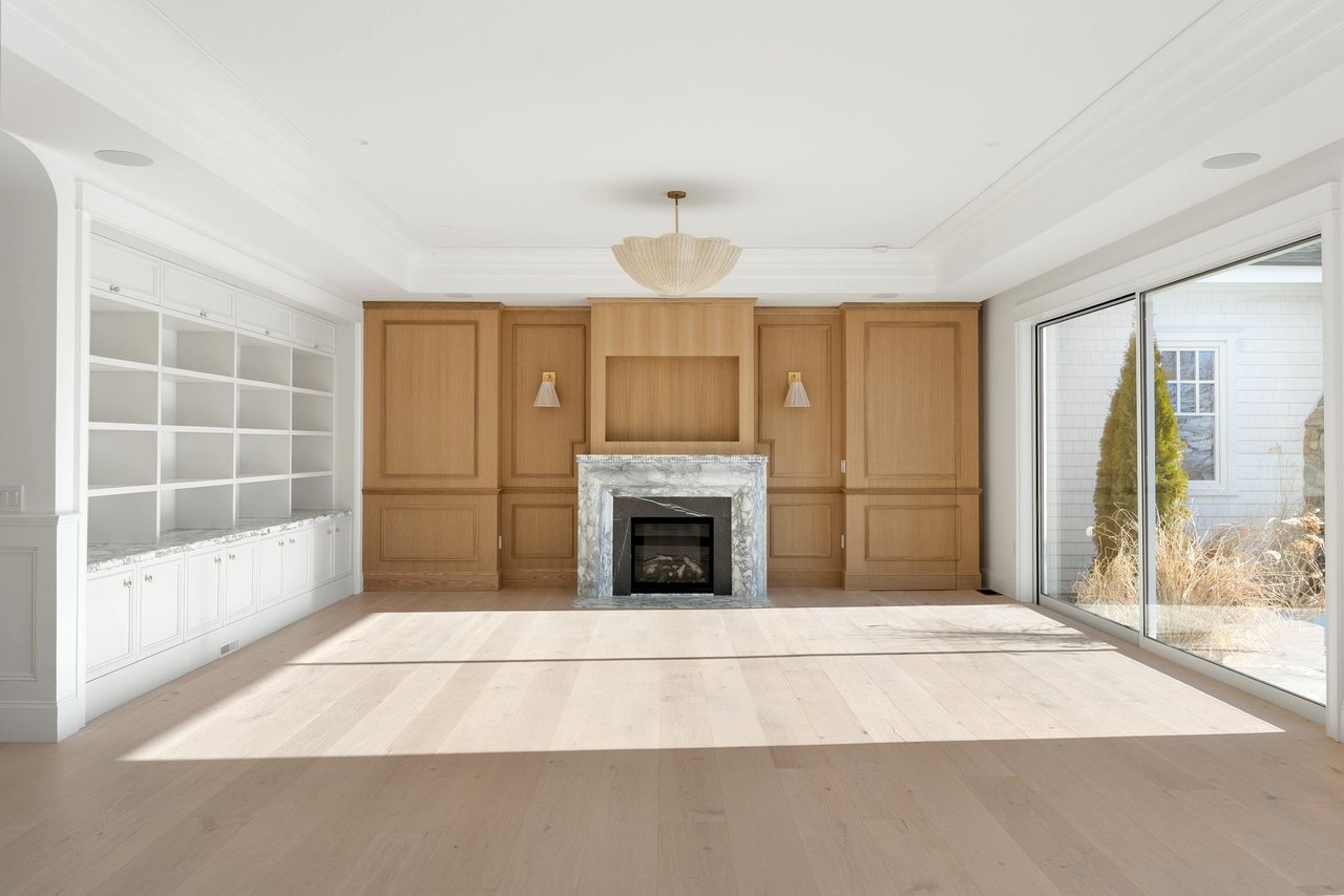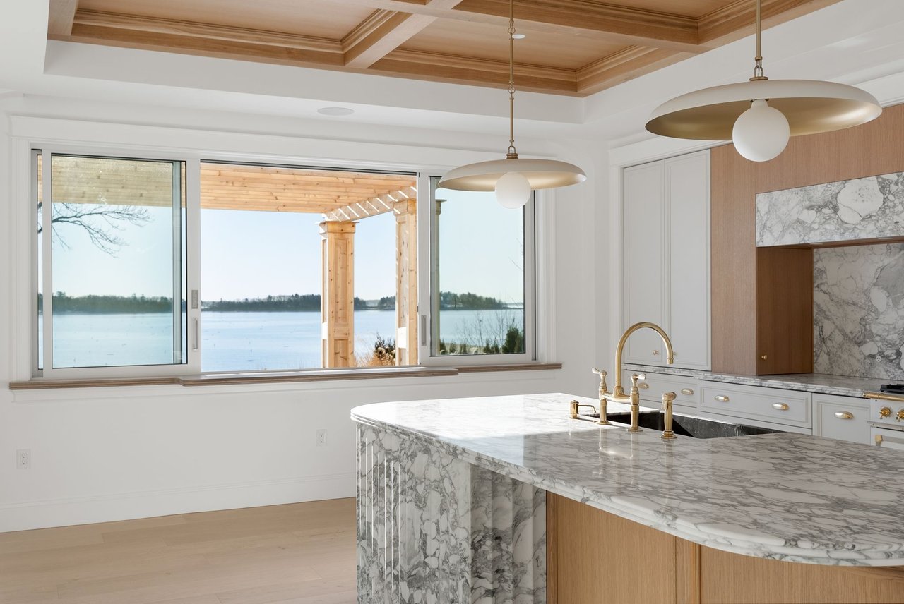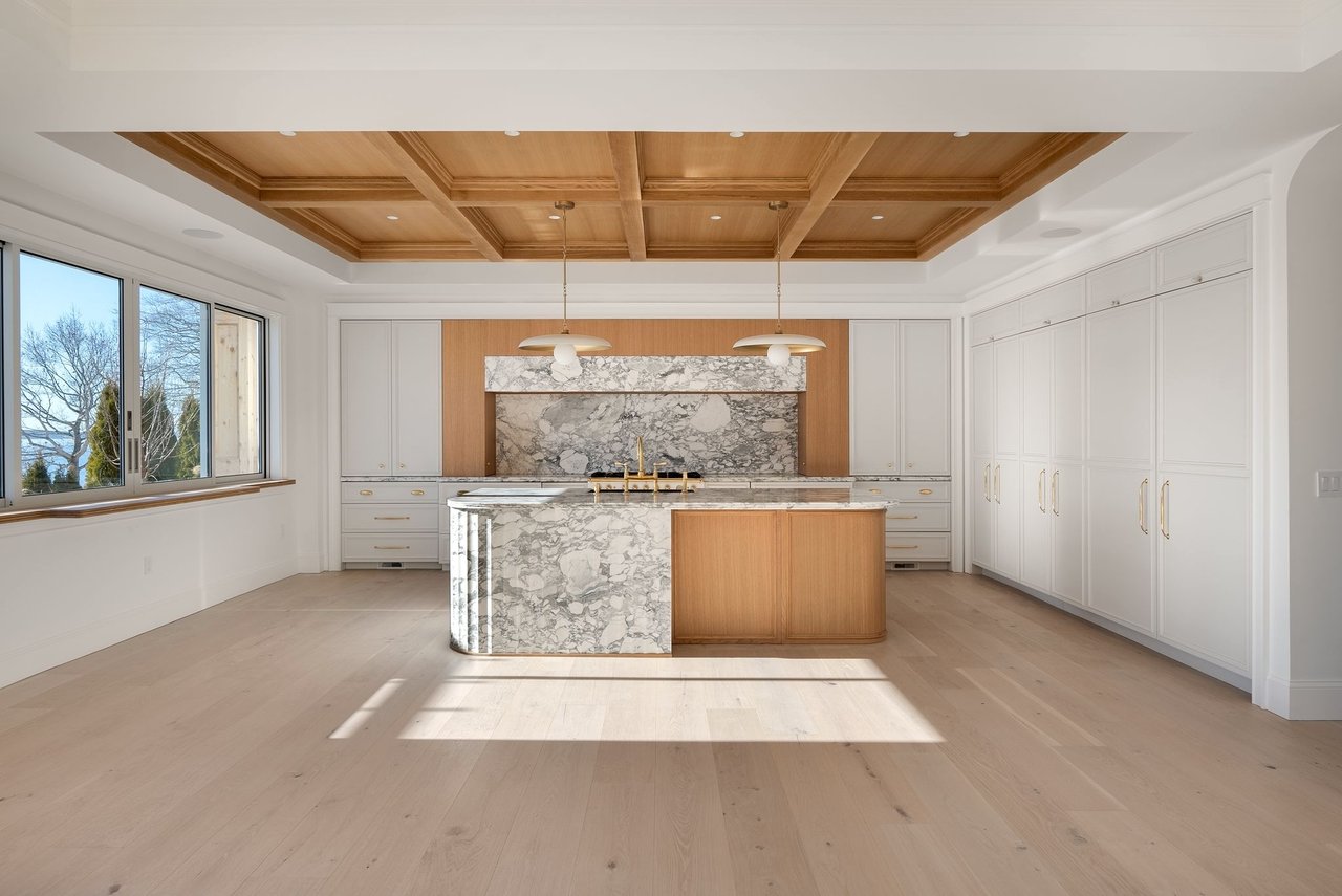Inside, classic materials and luminous interiors create an atmosphere of understated grandeur. Marble, richly paneled walls, and beautifully crafted coffered ceilings lend a sense of permanence and refinement rarely found in new construction. Sunlight pours through oversized windows and glass doors, filling the living spaces and blurring the line between indoors and the ever-changing waters beyond.