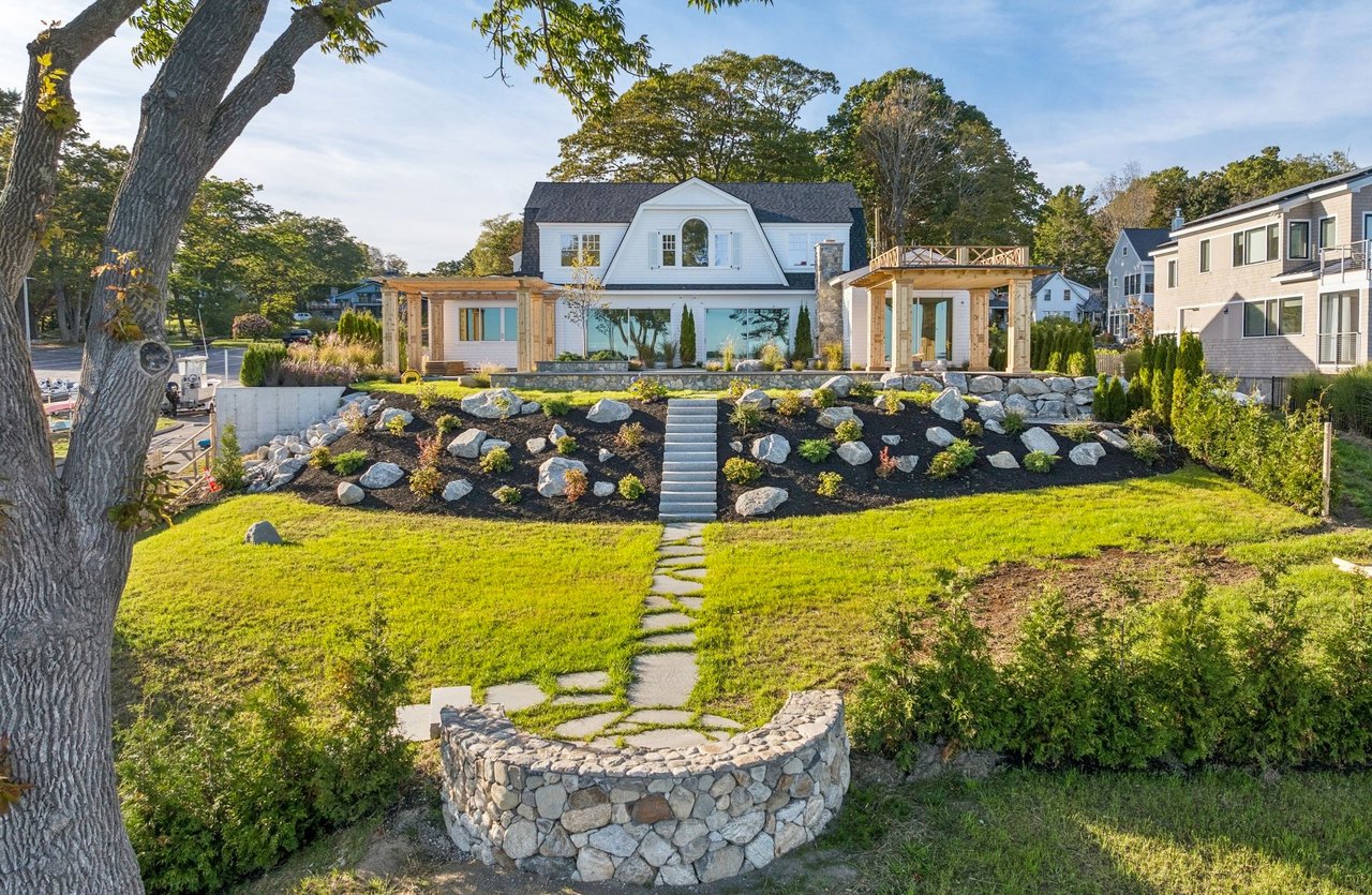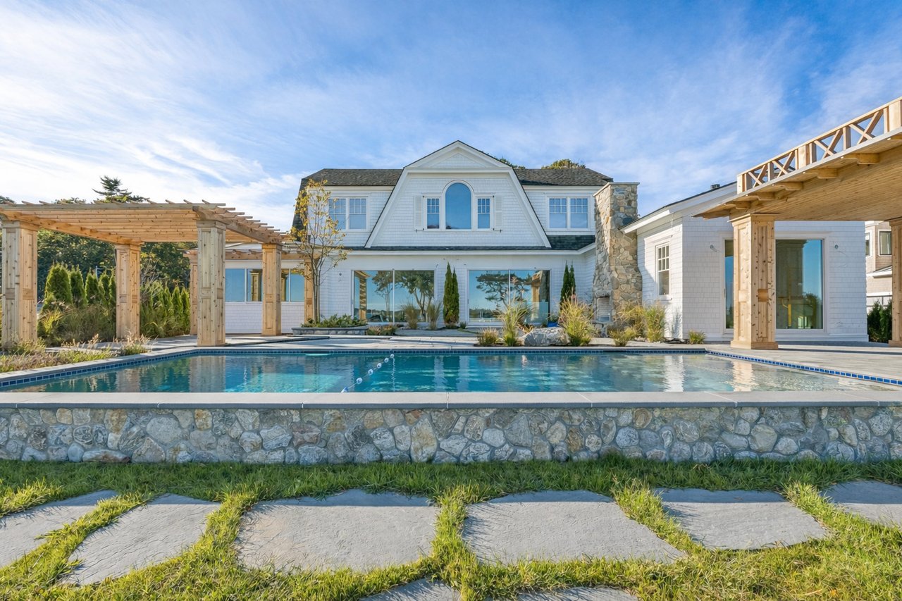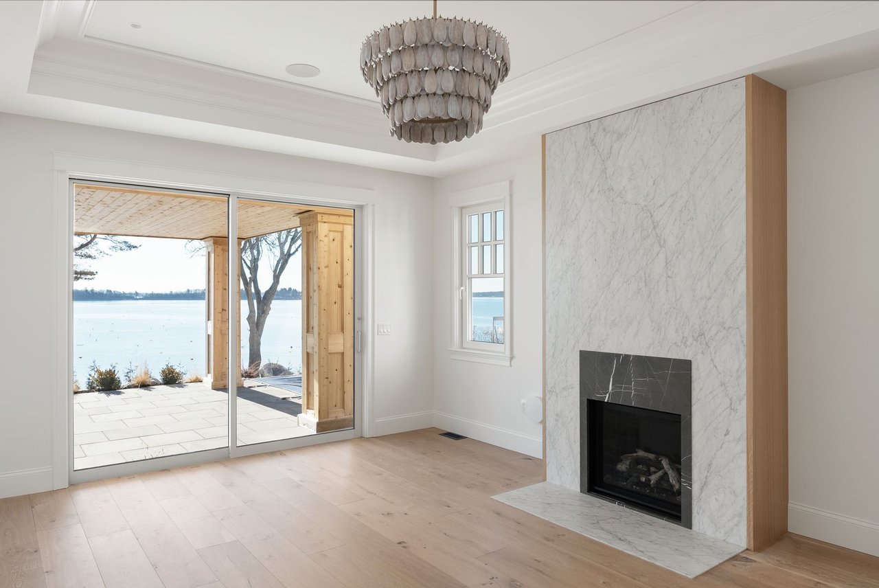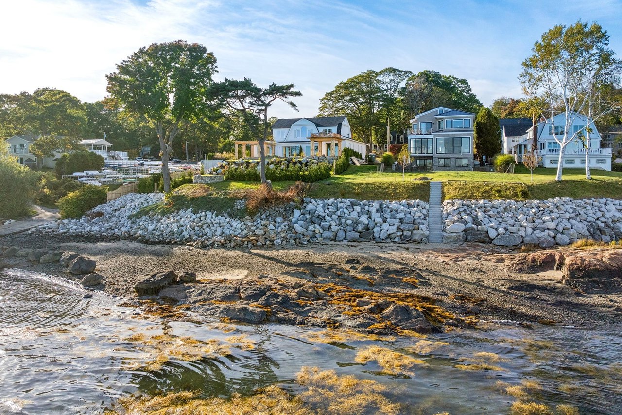 Set along the coveted waterfront of Falmouth Foreside, this newly completed shingle-style residence by architect Joe Waltman and the Wogan Brothers draws inspiration from the great oceanfront homes of the Northeast. Gambrel rooflines, cedar shingles, and finely detailed millwork give the home a timeless architectural presence along the shoreline, while expansive windows frame sweeping eastward views across Casco Bay to Clapboard Island.