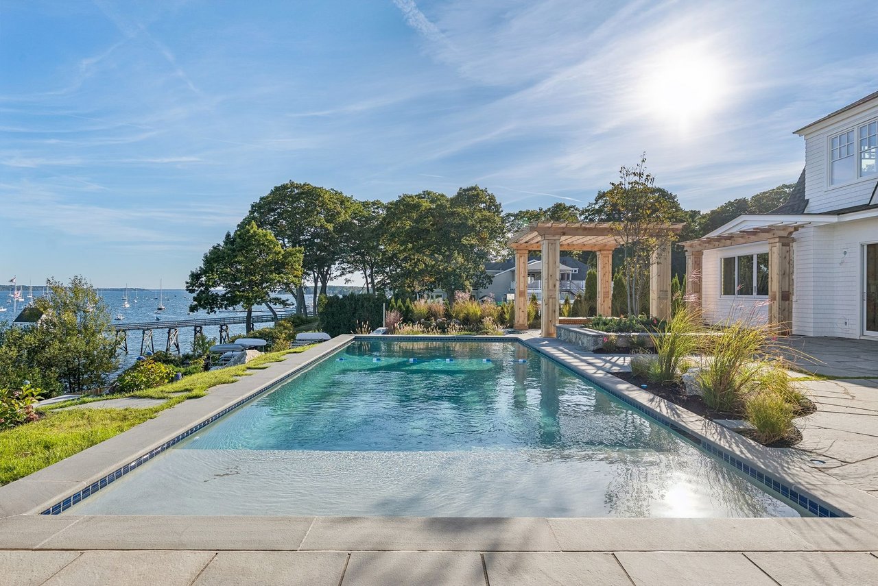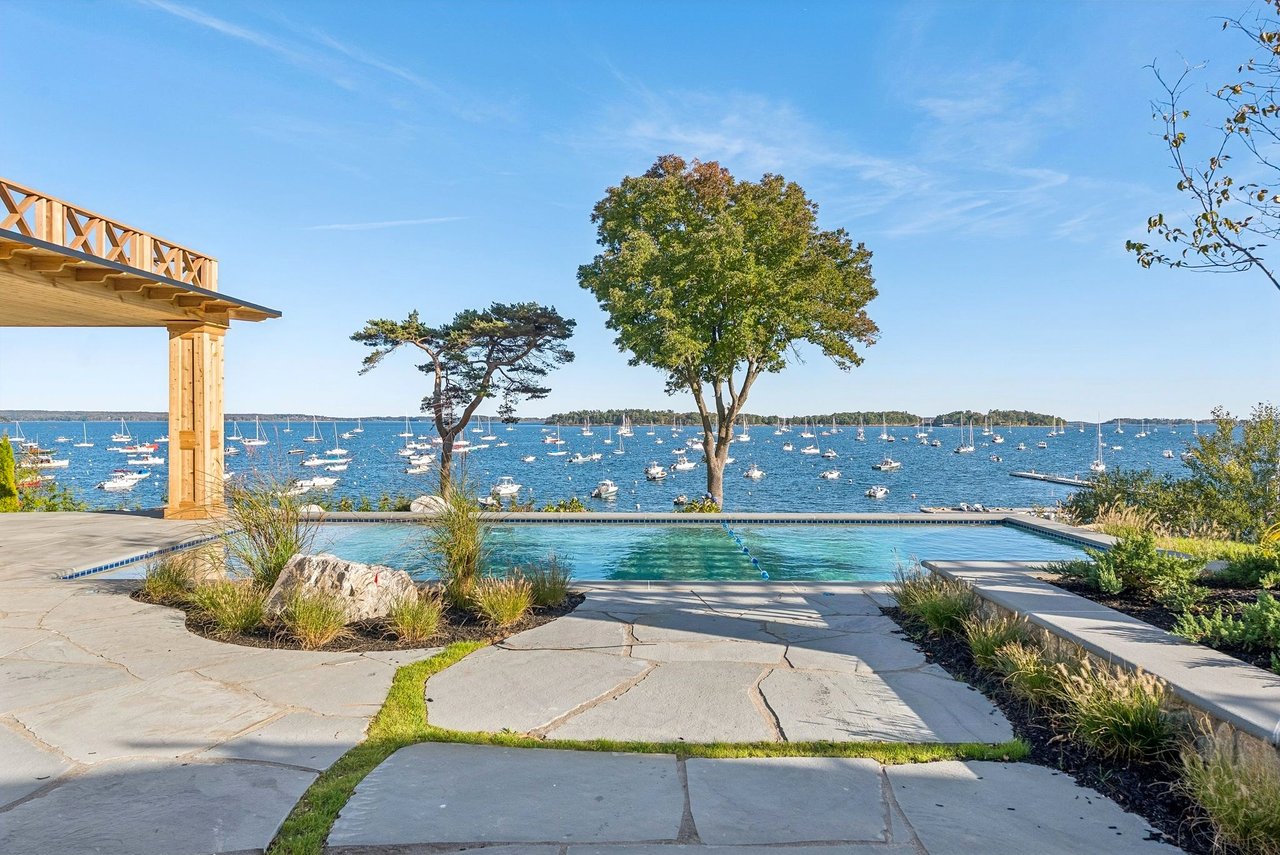 Outdoors, the experience of the waterfront continues with a heated gunite pool, firepit seating area, and two pergolas overlooking Casco Bay. Manicured coastal landscaping stretches toward the shoreline, where private water access offers the potential for a future dock.