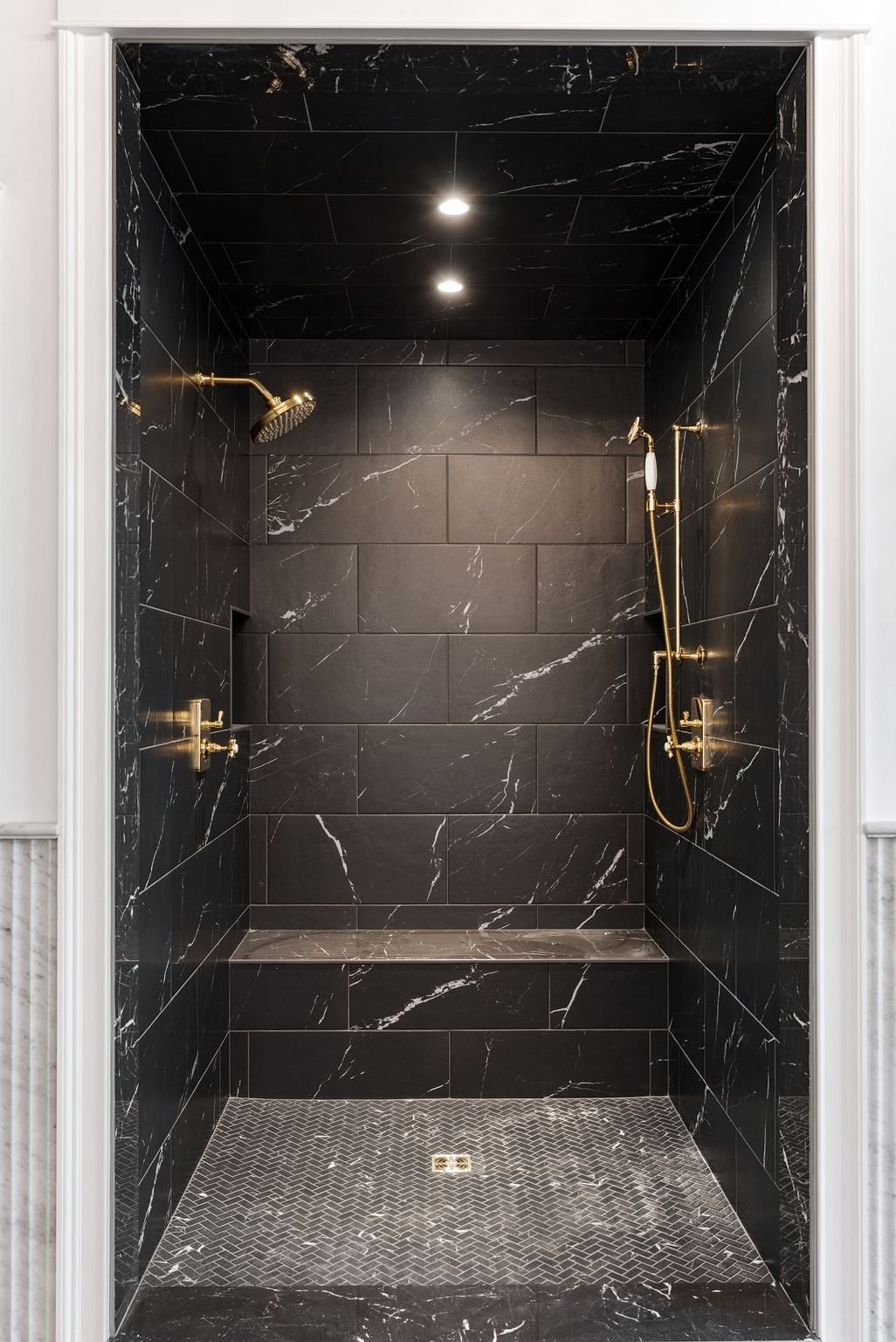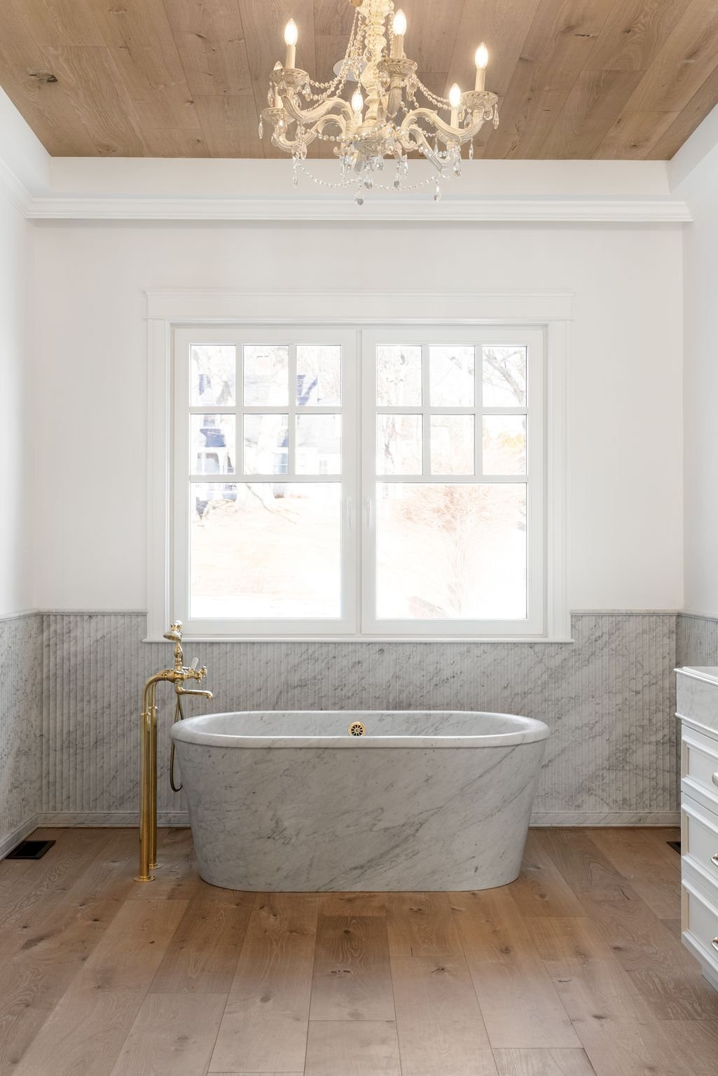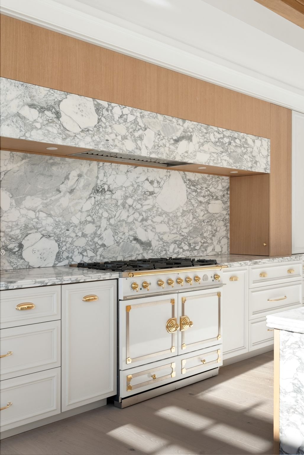 At the heart of the home, the kitchen is both sculptural and welcoming, anchored by a La Cornue range and fluted Arabescato marble, with custom cabinetry and thoughtful spaces designed as much for gathering as for cooking. Just beyond, a concealed paneled door reveals the main-level primary suite, an elegant private retreat where a fireplace and doors to the waterfront terrace create a quiet connection to the bay. A dramatic dressing room lined with glass-front wardrobes leads to a luminous Carrara marble bath centered around a soaking tub beneath sparkling chandeliers.