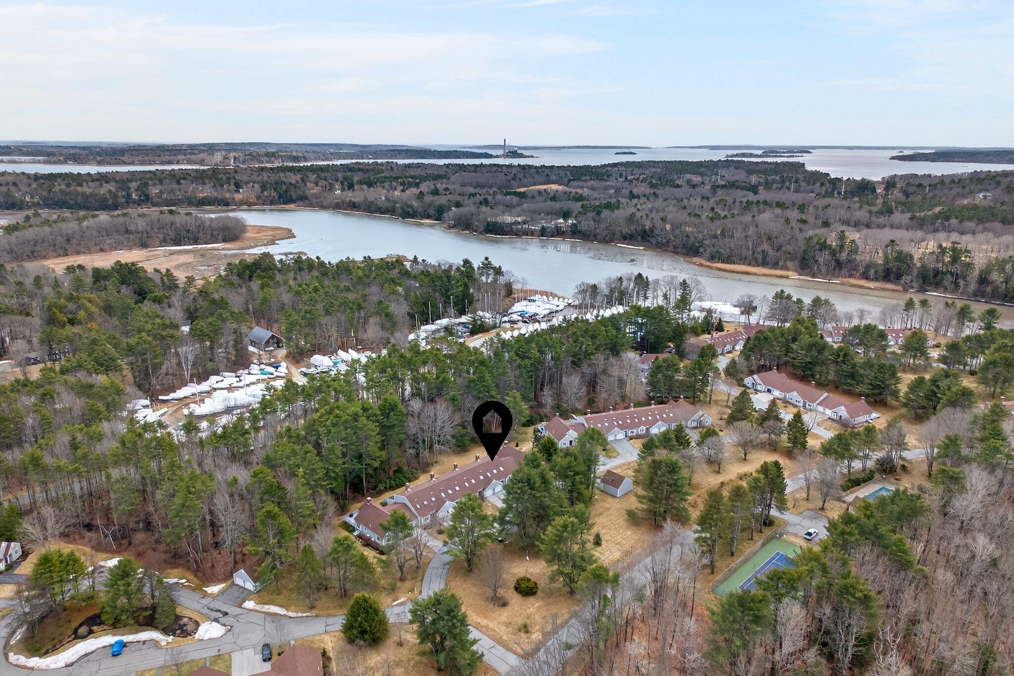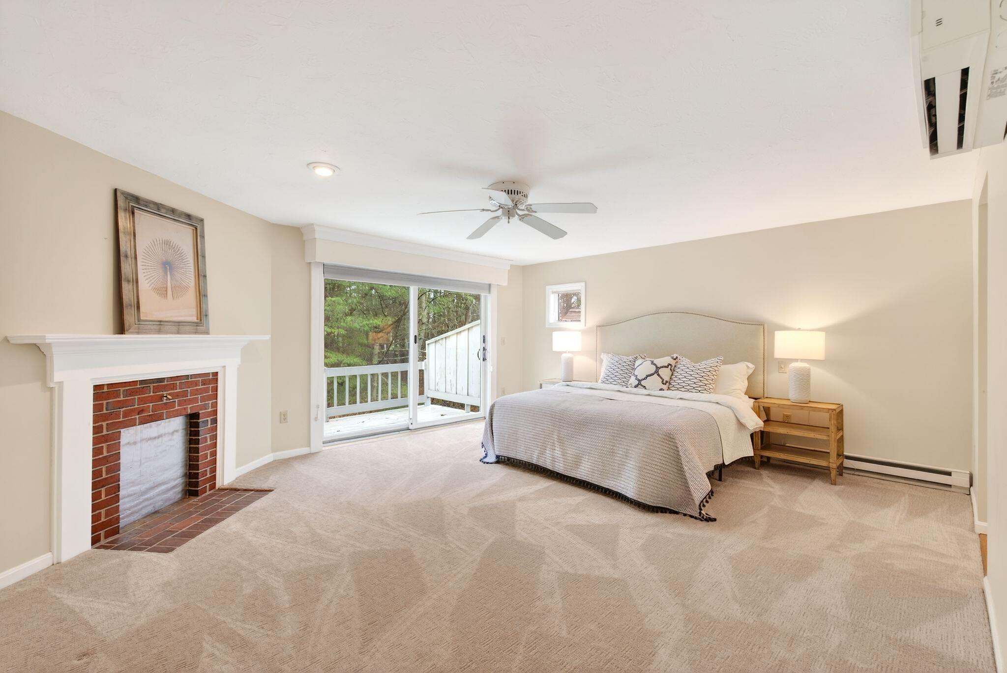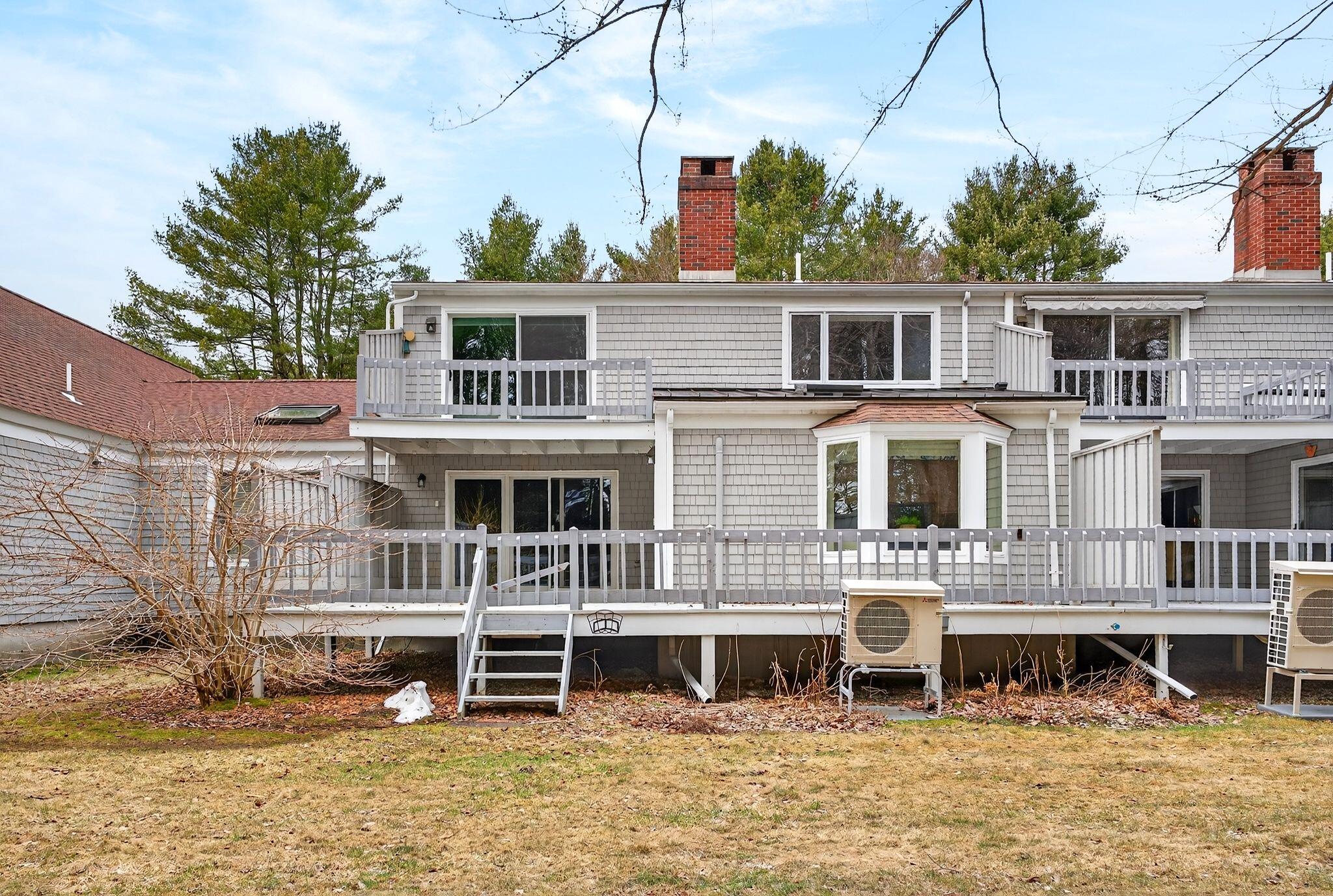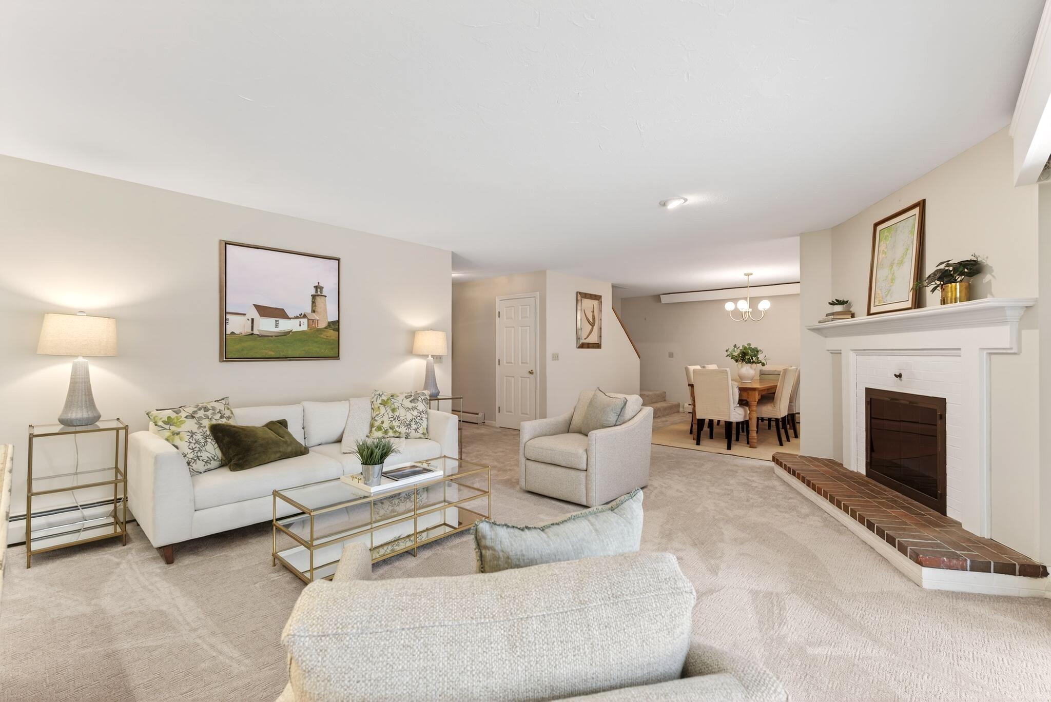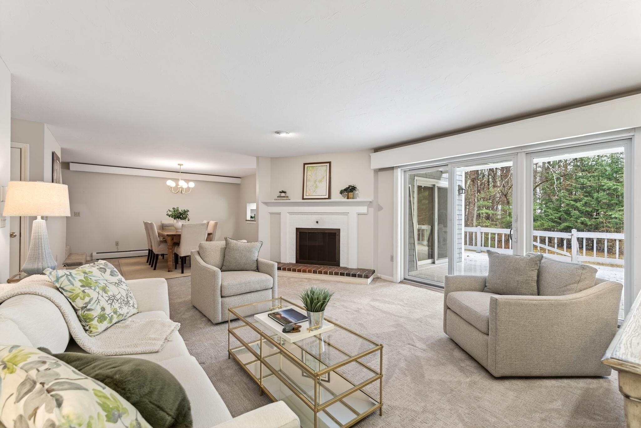 Located in the highly desirable Blueberry Cove community along the Royal River, this spacious condo offers a comfortable layout paired with a peaceful, natural setting. Enjoy views of the surrounding green space from your private deck, with walking trails to the water, as well as access to a pool, clubhouse, and tennis and pickleball courts just moments away. The main level is thoughtfully designed for everyday living, featuring an open layout, a flexible den or office that can easily serve as a bedroom, and a full bath nearby, ideal for guests or convenient single-level living. The living area showcases a wood-burning fireplace and flows seamlessly into the kitchen and dining space, with sliding doors that open to the back deck. Upstairs, the primary suite provides a private retreat complete with its own fireplace and balcony. A second bedroom, full bath with laundry, and an additional flex room offer excellent versatility for a variety of needs. Efficient heat pumps ensure year-round comfort, while the attached heated garage adds everyday convenience. All of this is just minutes from Yarmouth Village and a short drive to Portland.