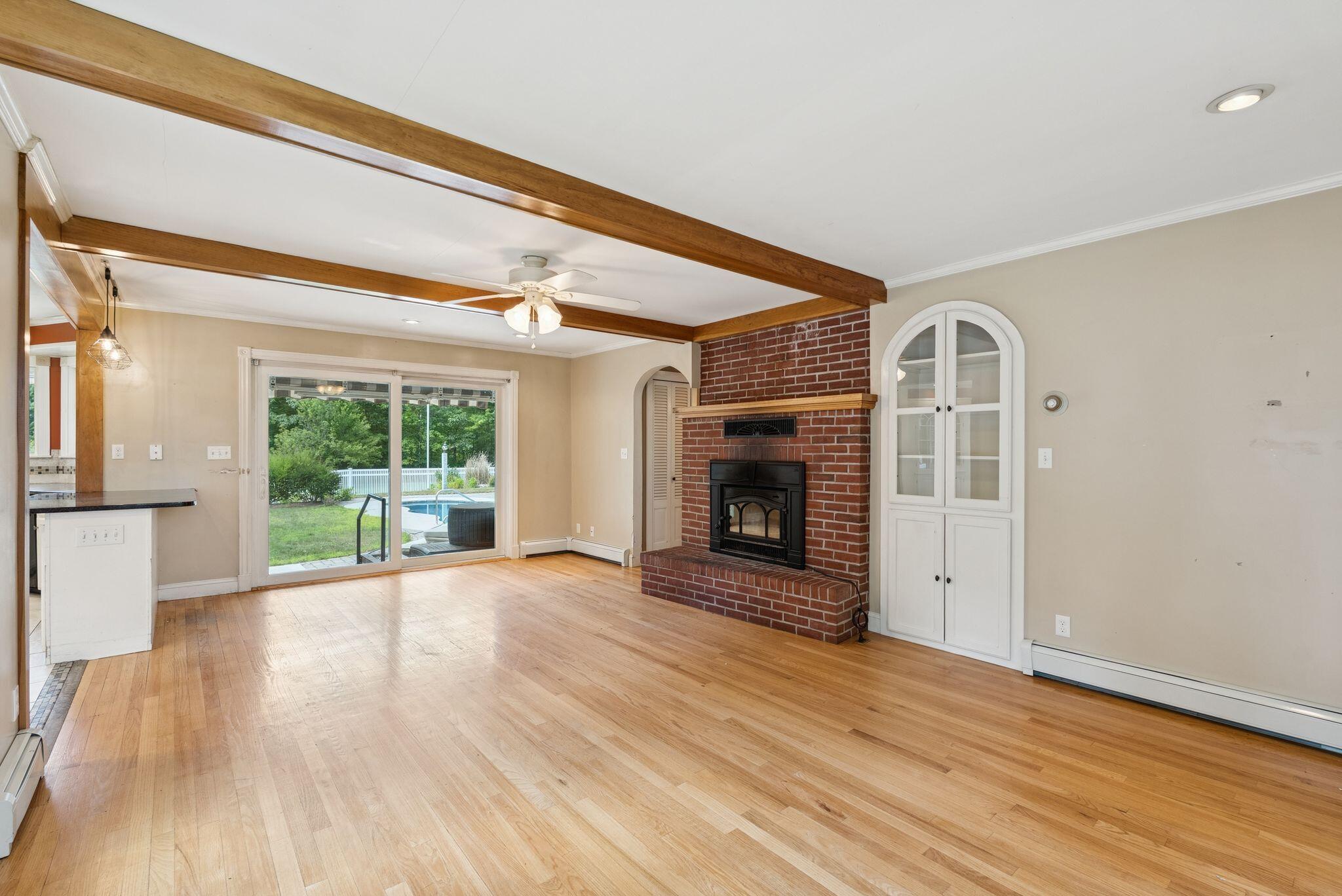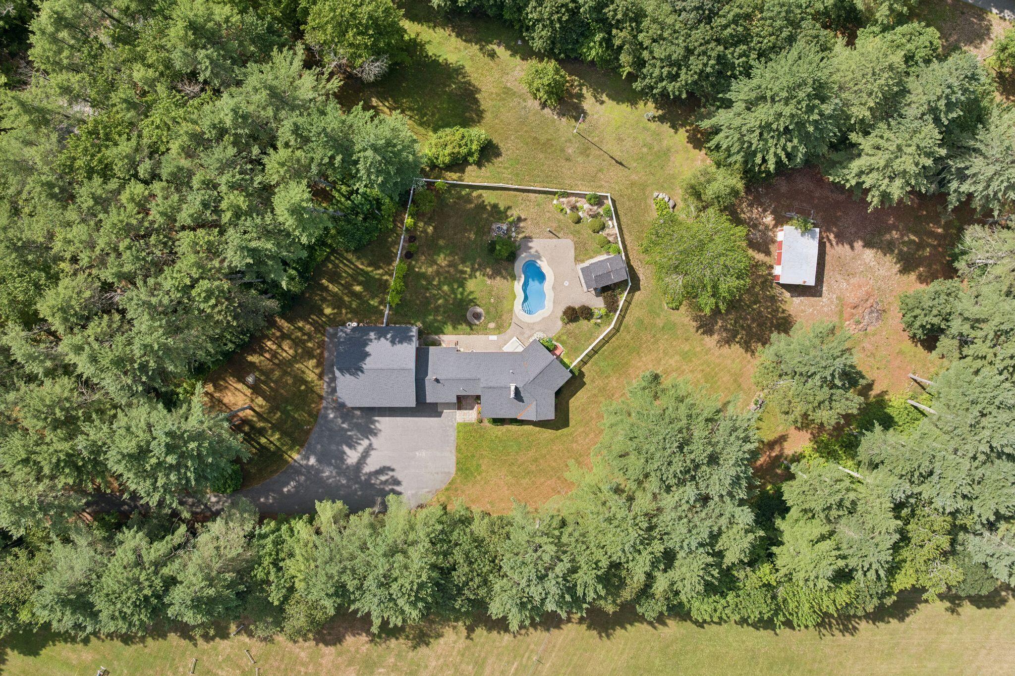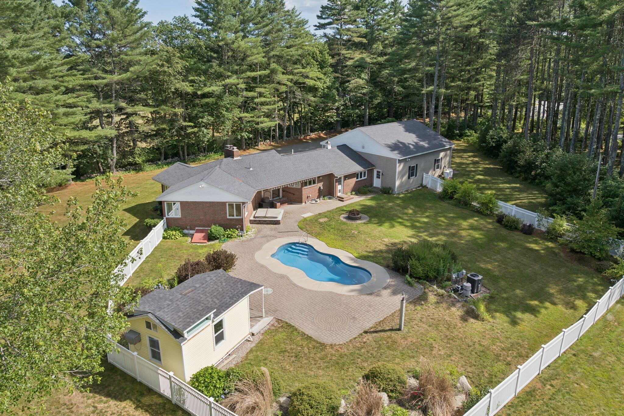 Set on a private and expansive 3 acre lot this home is the perfect location for hobbyists or professionals alike, featuring abundant storage for machinery and ample workshop space to bring your projects to life in the comfort of your own home. This charming ranch style property offers 1,708 square feet of main-level living, featuring 3 bedrooms, 1 full bath, and 1 half bath all designed for relaxed daily living. Enter into the inviting eat-in kitchen with tile flooring and a breakfast nook to start your morning off right, and just down the hallway, you'll find a conveniently located laundry area that adds to the home's practical flow. Providing a lovely area for quiet evenings or gathering is the spacious living room that offers warmth and character with a wood stove and built-in shelving. The primary bedroom includes a generous walk-in closet, while two additional bedrooms provide flexible space for family, guests, or a home office. Downstairs, the unfinished basement with a second fireplace holds exceptional potential for expanded living space or a recreation area. Outside, enjoy your own beautifully landscaped grounds with an in-ground pool, and a charming cabin with a loft that provides great options as a guest suite, studio, or pool house. The oversized 4-car attached garage with high ceilings and workshop space provides plenty of room for hobbies, storage, or future customization. Whether you're spending time indoors or enjoying the privacy of the outdoor setting, this home offers comfort, space, and potential!