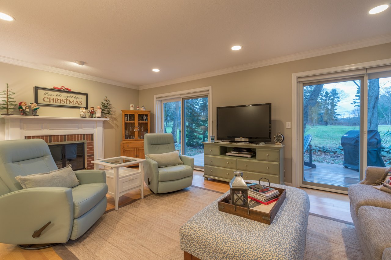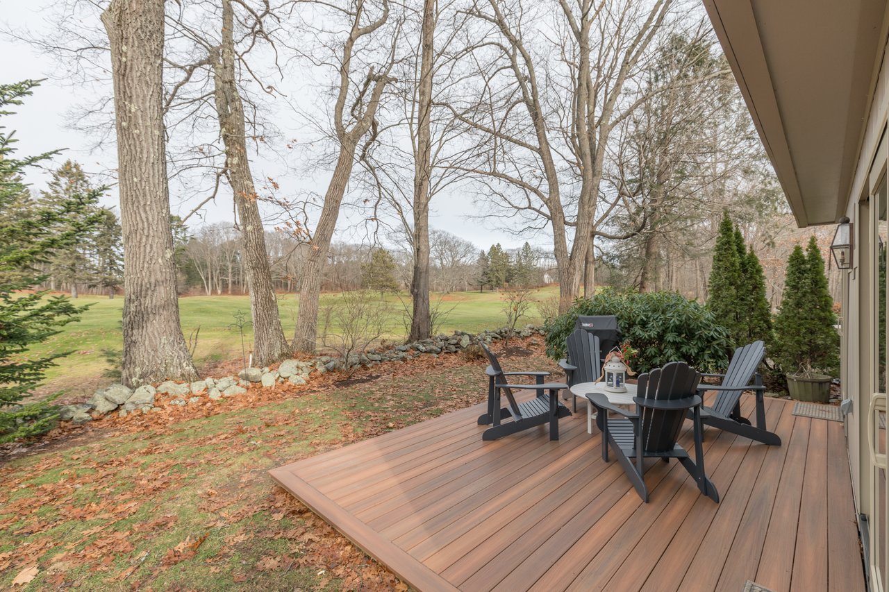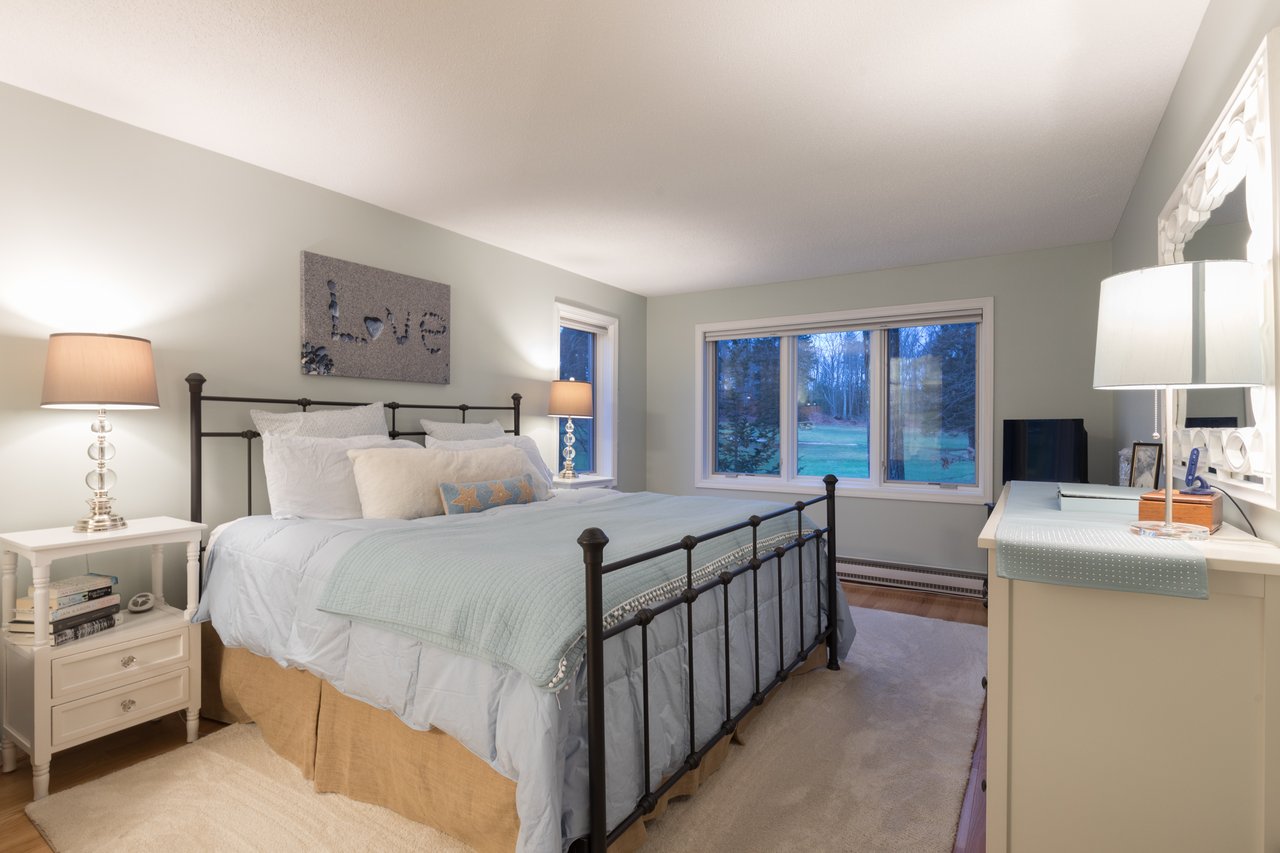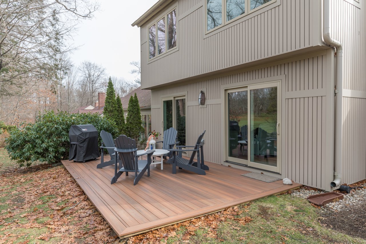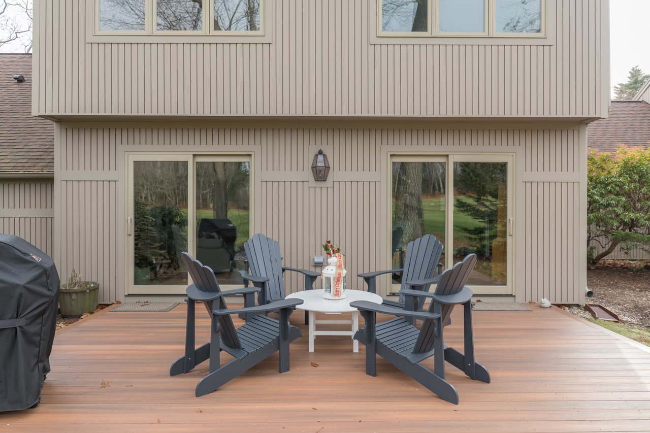 Recently remodeled, this townhouse style unit offers a renovated kitchen with new flooring, cabinetry, quartz counter tops, and new stainless steel range and refrigerator. The comfortable floor plan features a casual sitting area off the kitchen with new carpeting and skylights allowing for an abundance of natural light. The formal dining area offers built-ins while the living room with fireplace provides access to the private deck overlooking the golf course. The second level features a large master suite with two closets and a full bath with double vanities. Both bedrooms have lovely views of the well-manicured course. New heat pump system keeps this unit warm in the winter and cool in the summer. Enjoy the neighborhood amenities with two tennis courts, clubhouse, heated pool, and snowshoeing or cross country skiing at the Purpoodock Club!