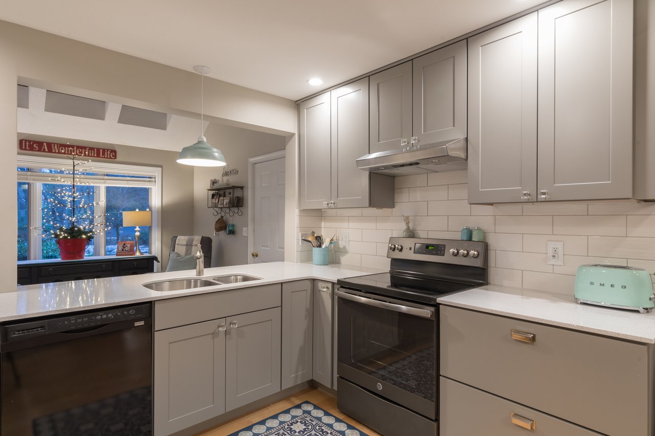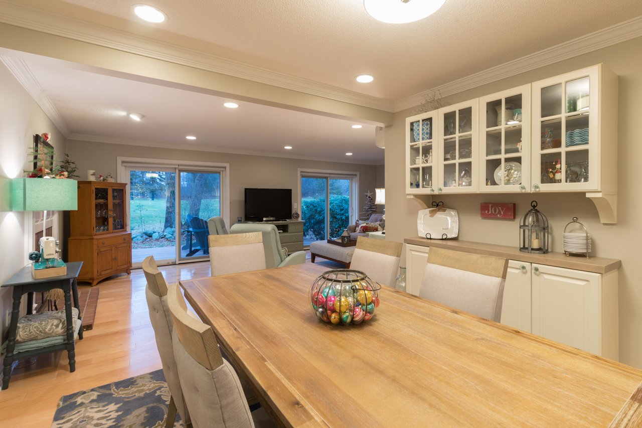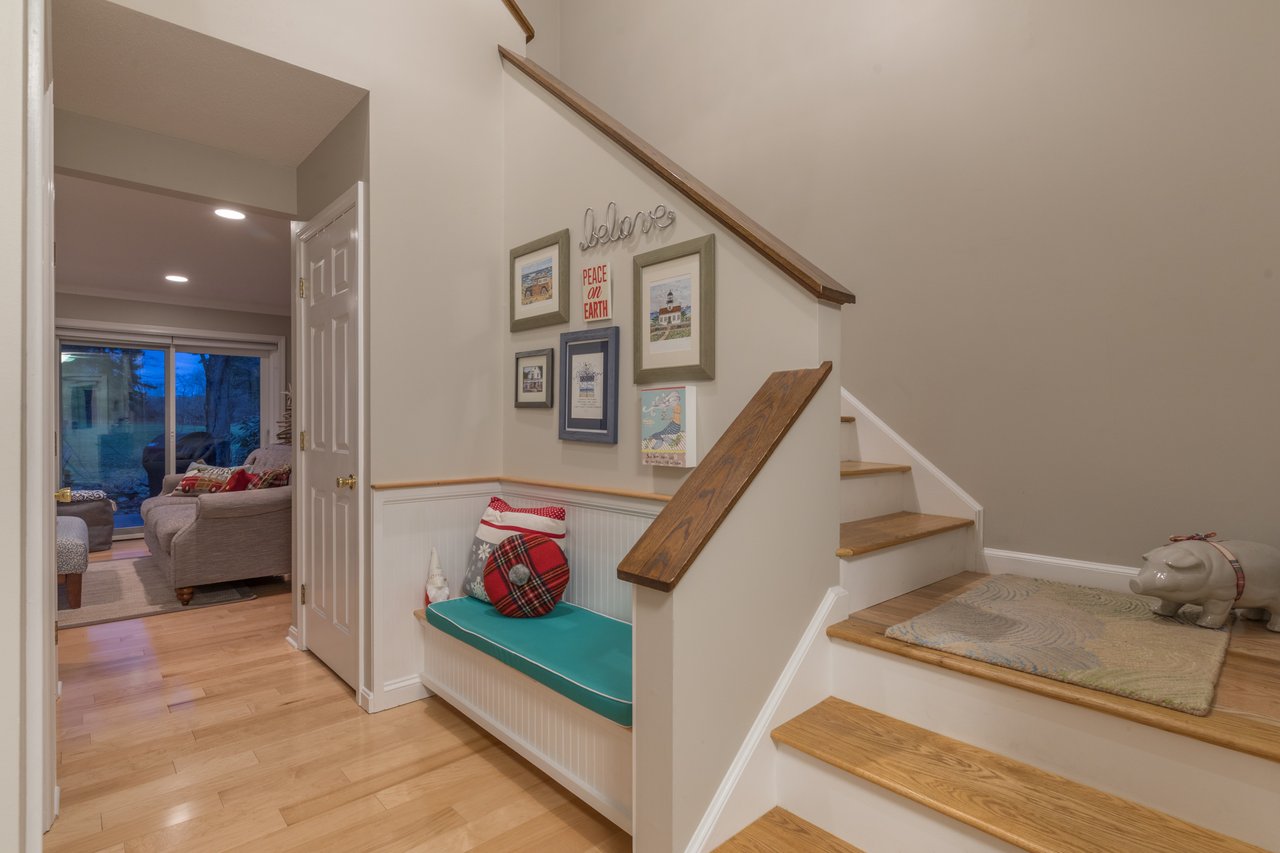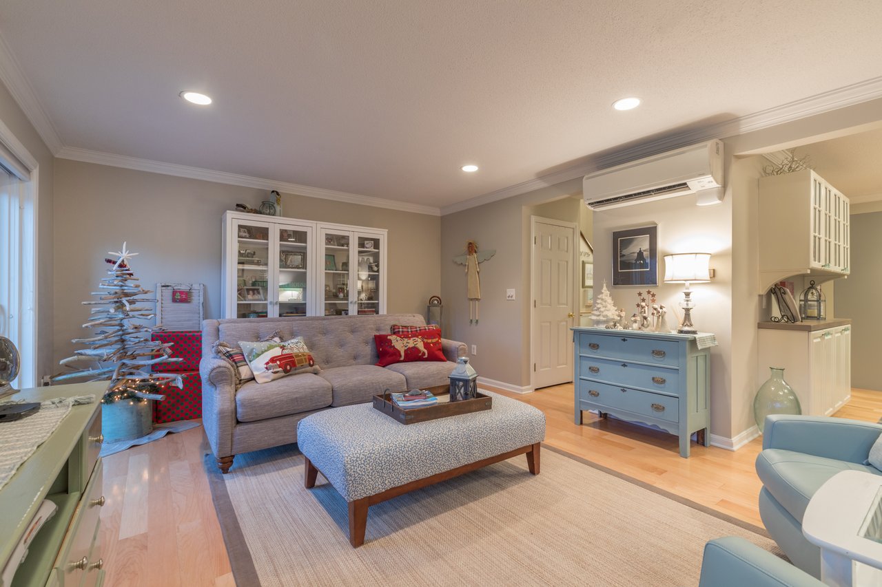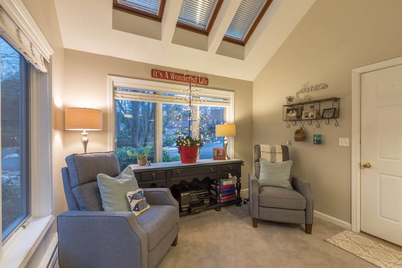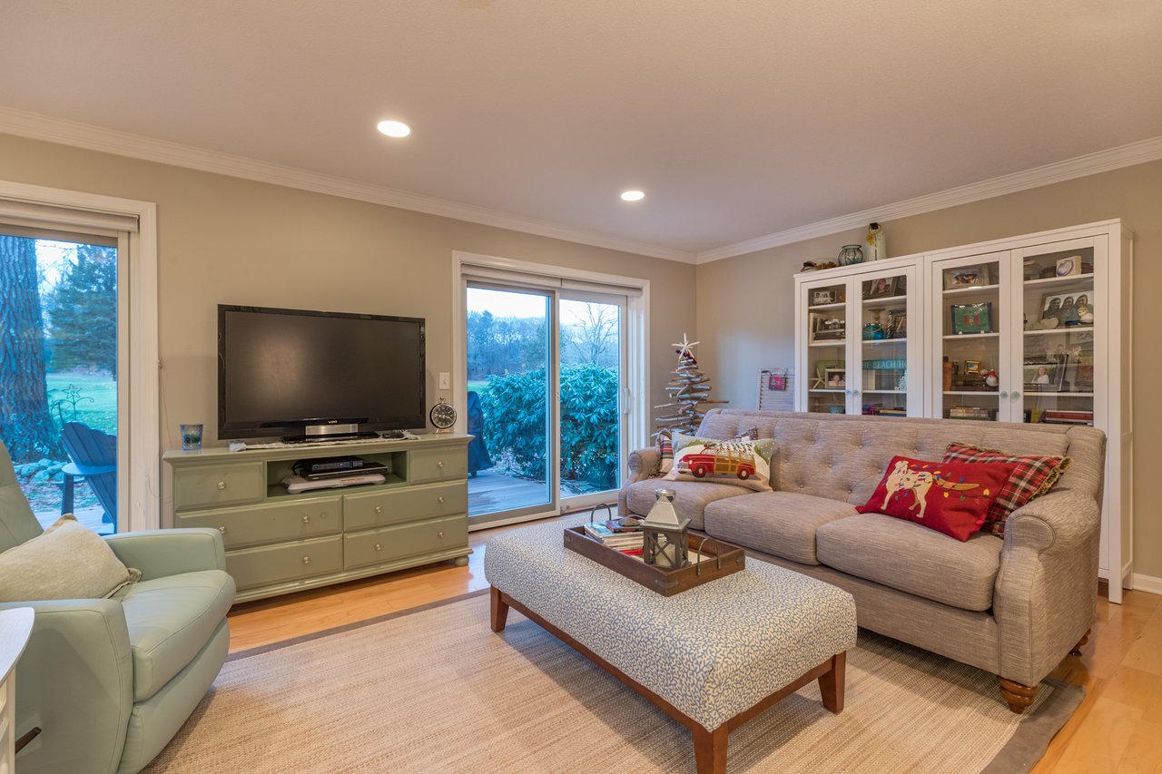 Recently remodeled, this townhouse style unit offers a renovated kitchen with new flooring, cabinetry, quartz counter tops, and new stainless steel range and refrigerator. The comfortable floor plan features a casual sitting area off the kitchen with new carpeting and skylights allowing for an abundance of natural light. The formal dining area offers built-ins while the living room with fireplace provides access to the private deck overlooking the golf course. The second level features a large master suite with two closets and a full bath with double vanities. Both bedrooms have lovely views of the well-manicured course. New heat pump system keeps this unit warm in the winter and cool in the summer. Enjoy the neighborhood amenities with two tennis courts, clubhouse, heated pool, and snowshoeing or cross country skiing at the Purpoodock Club!