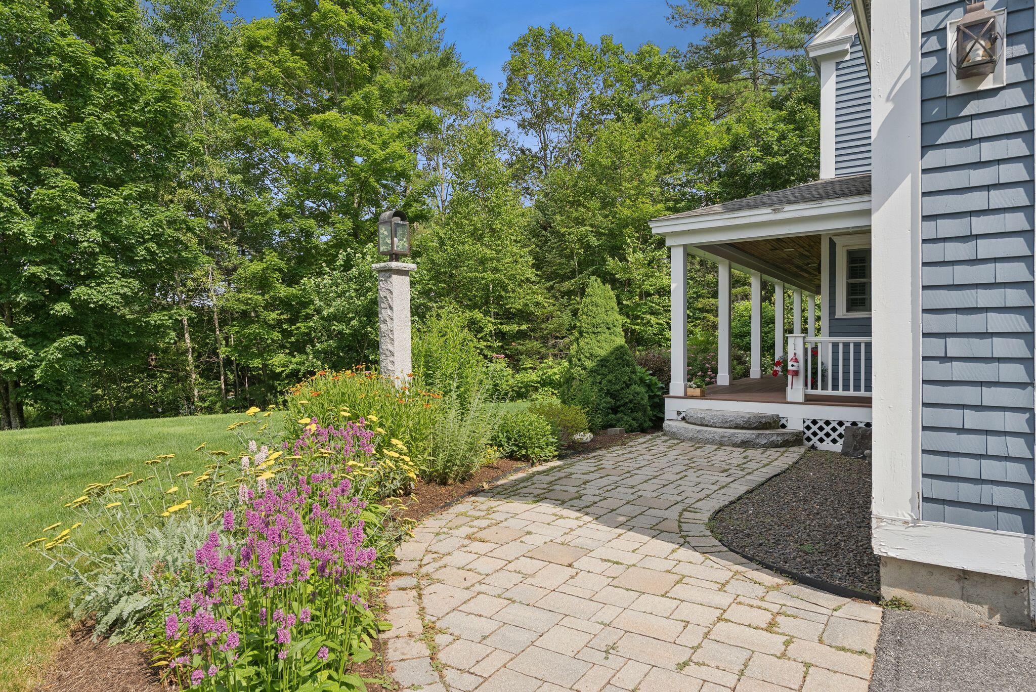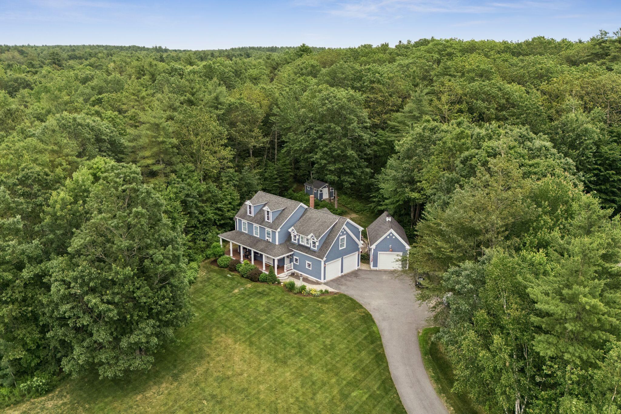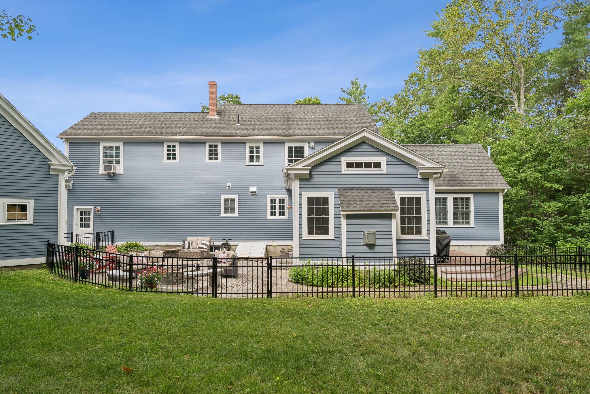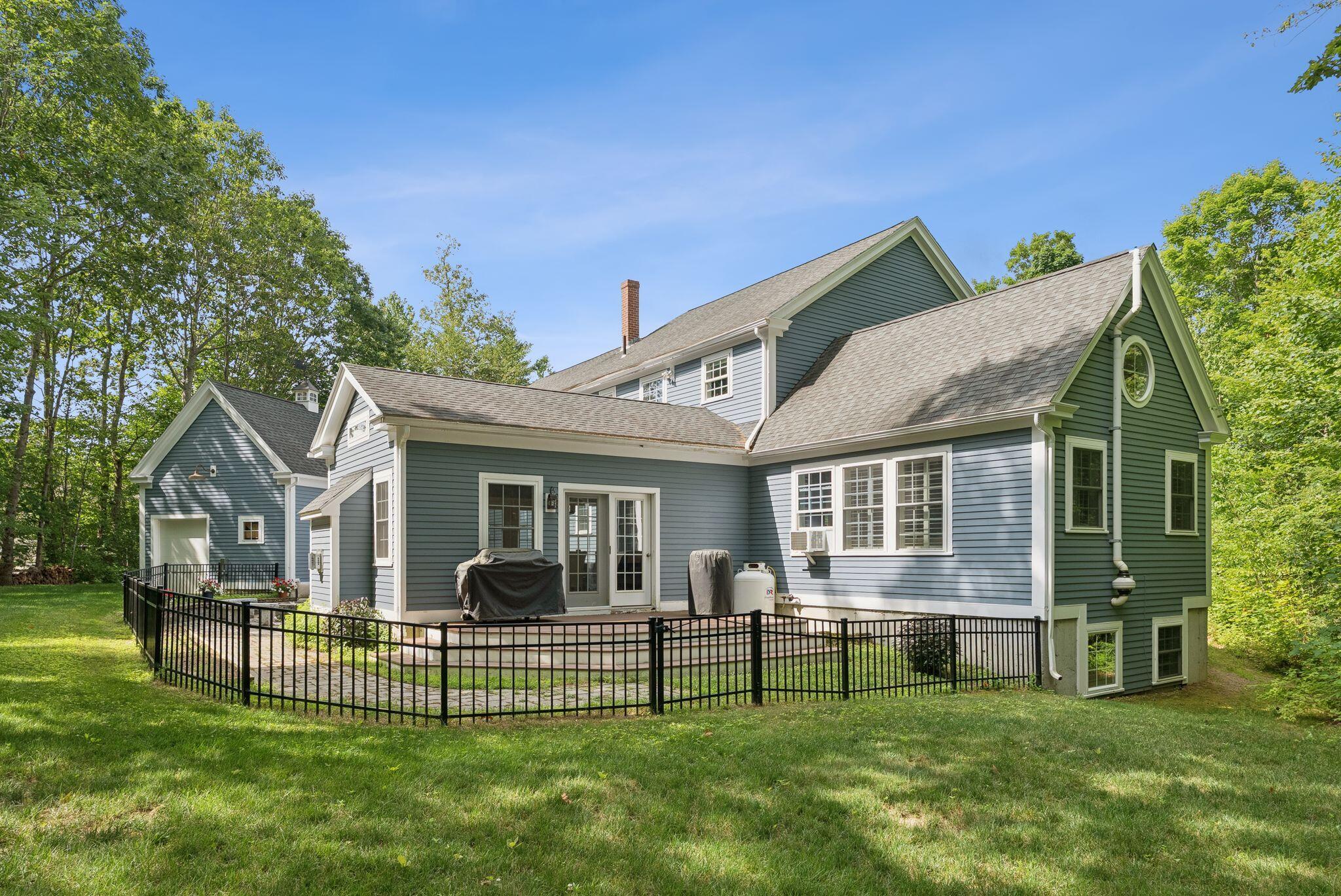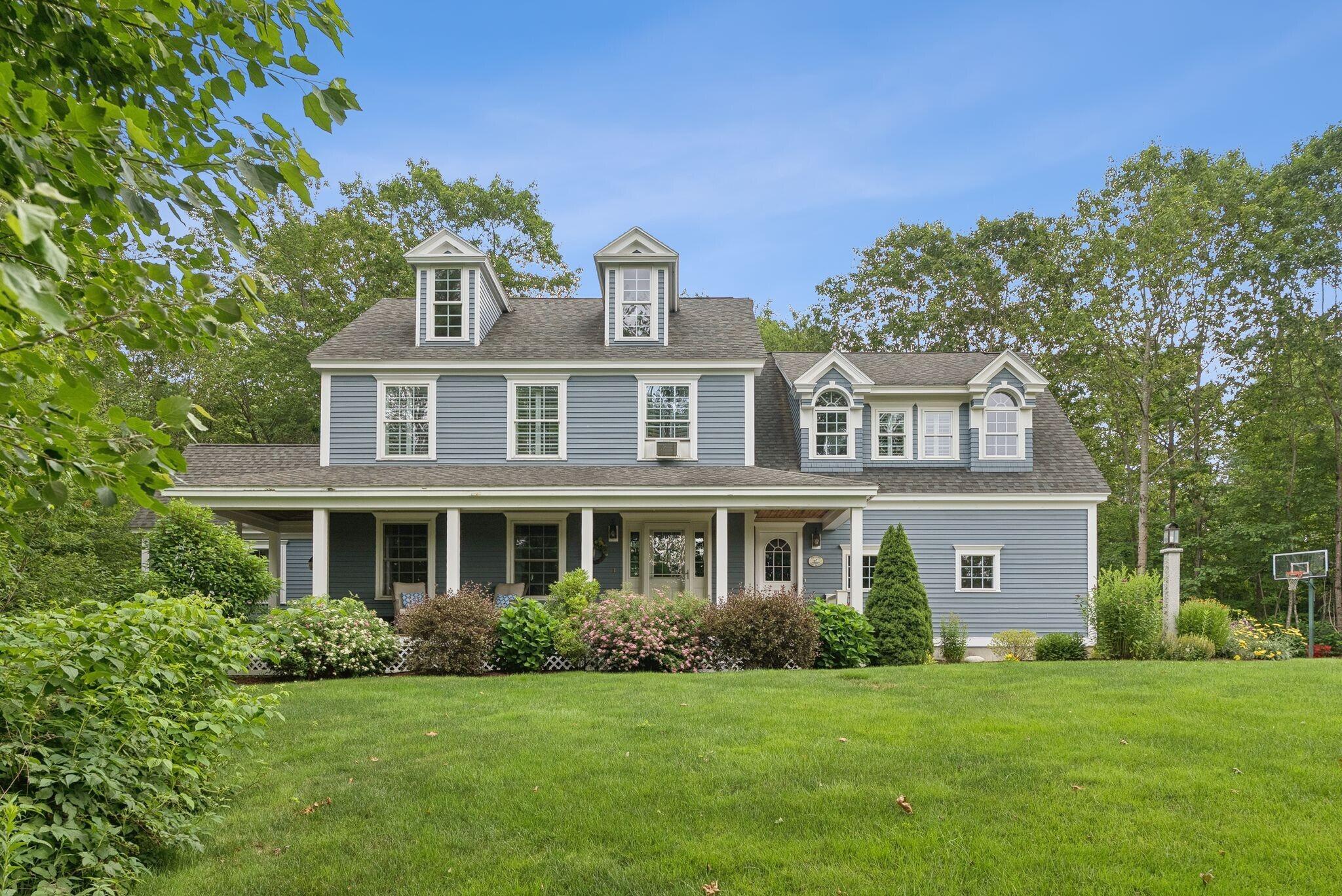 This stunning classic Colonial combines elegance with modern design. Beautifully landscaped grounds and an inviting front porch set the tone for this special home. Located in a quiet, friendly neighborhood, it provides exceptional privacy and ample parking, including three garage spaces, ideal for entertaining or large gatherings. The thoughtfully designed outdoor space features a private back patio, uniquely enclosed by the home and detached garage, creating a cozy, courtyard-like feel. Enter inside through a tiled mudroom with built-in storage, perfect for keeping life organized. The interior is designed with an exciting and versatile floor plan with plenty of room for guests, relaxation, and everyday living. Creating an inviting atmosphere the spacious eat-in kitchen opens into a grand living room with high cathedral ceilings and gleaming hardwood floors. A sunlit dining room with cathedral ceilings, gas fireplace, and wall-to-wall windows floods the space with natural light and provides direct access to the back patio. Convenience abounds with a first-floor laundry room and additional family room with a gas fireplace. The primary suite includes a full bath with double vanity and striking tiled shower, and three additional bedrooms on the second floor there's ample space for family or guests. The finished basement adds even more living space, with a recreation area that's excellent for games or exercise, a bar with seating, built-ins, and a private bedroom with a full bath. Adding to its appeal, the home offers direct access to the scenic Fuller Farm trails right from the back door. Enjoy excellent bird watching, and 2.6 miles of peaceful trails, it's a nature lover's dream. Ideally just 20 minutes from vibrant downtown Portland and only 15 minutes from Maine's renowned public beaches along the Atlantic coast, this home has comfort, style, convenience, and functionality in a beautiful, private setting; it's a must-see!