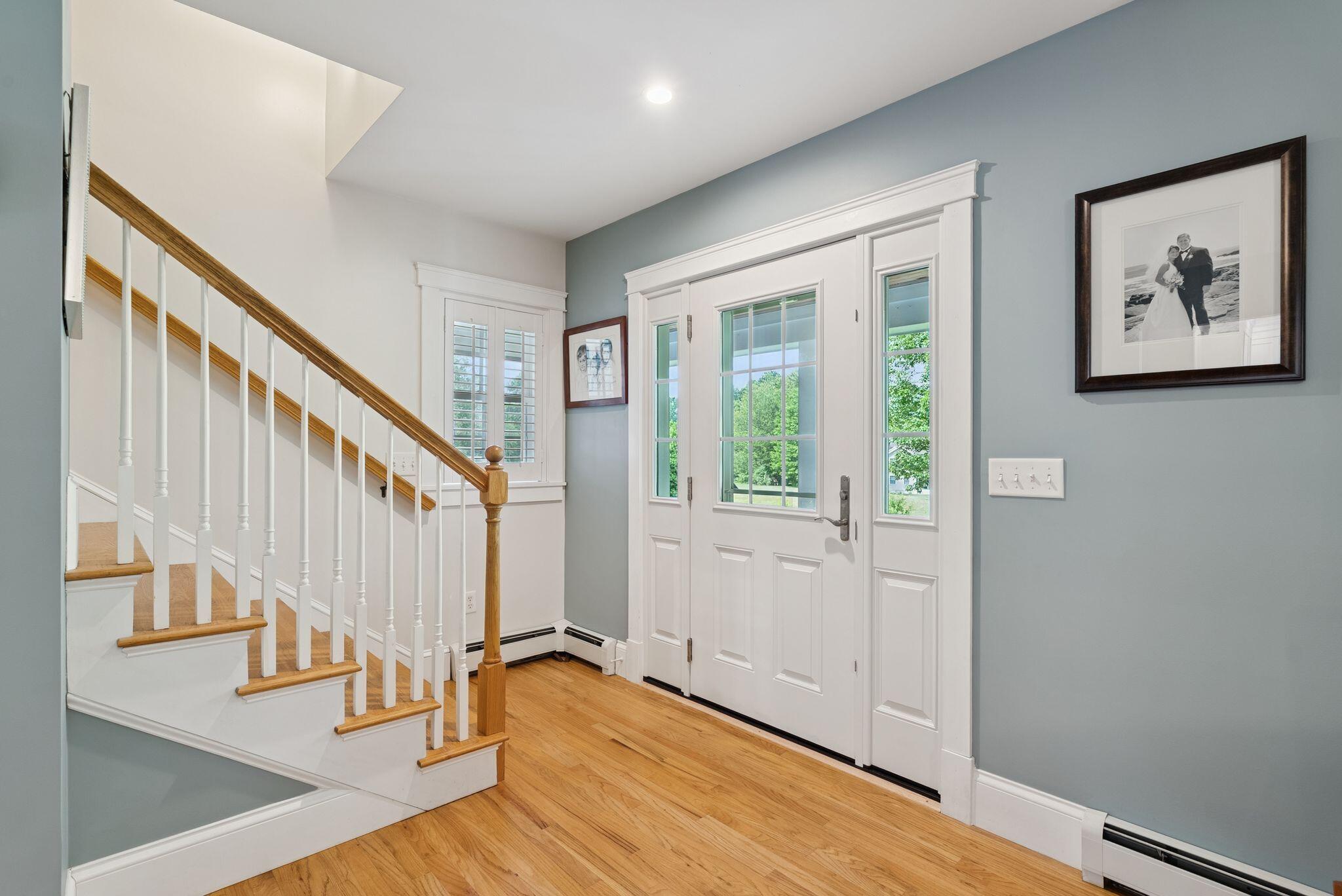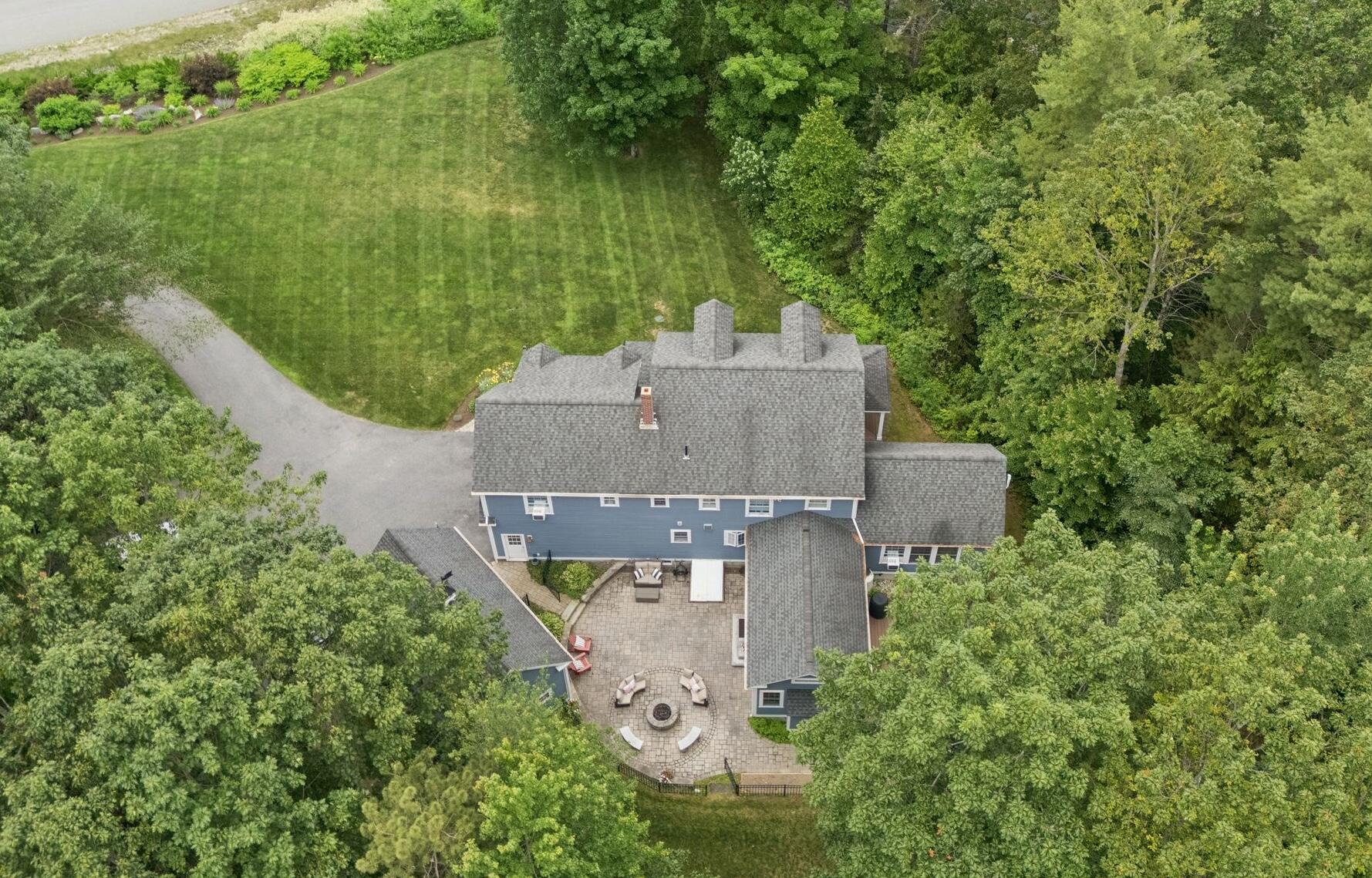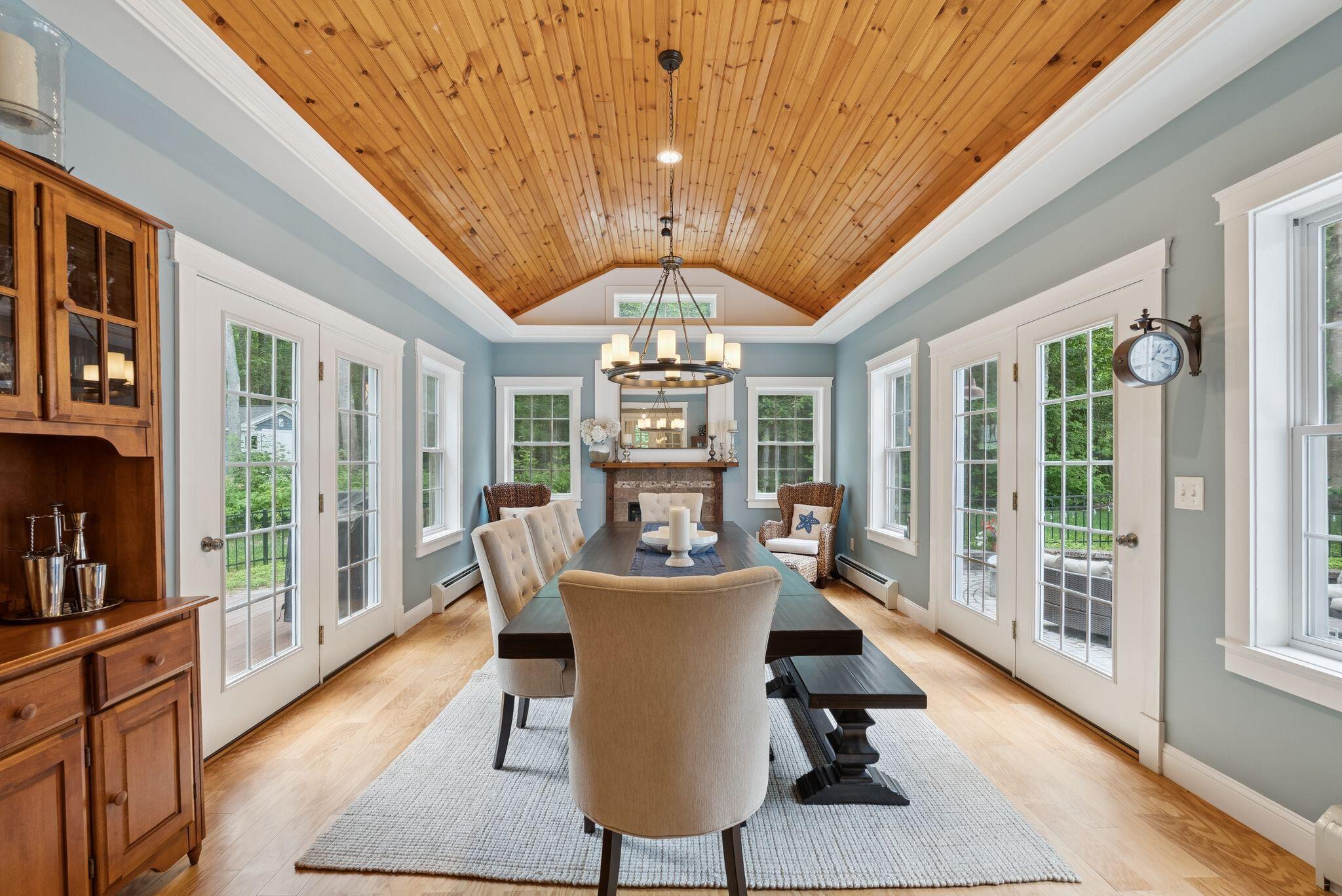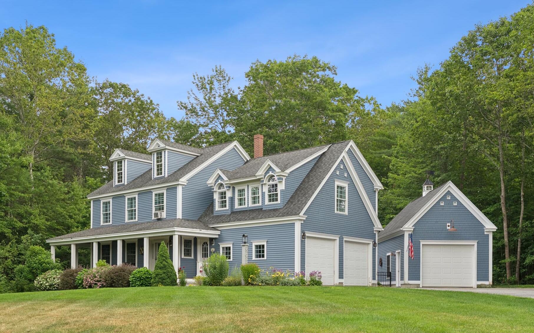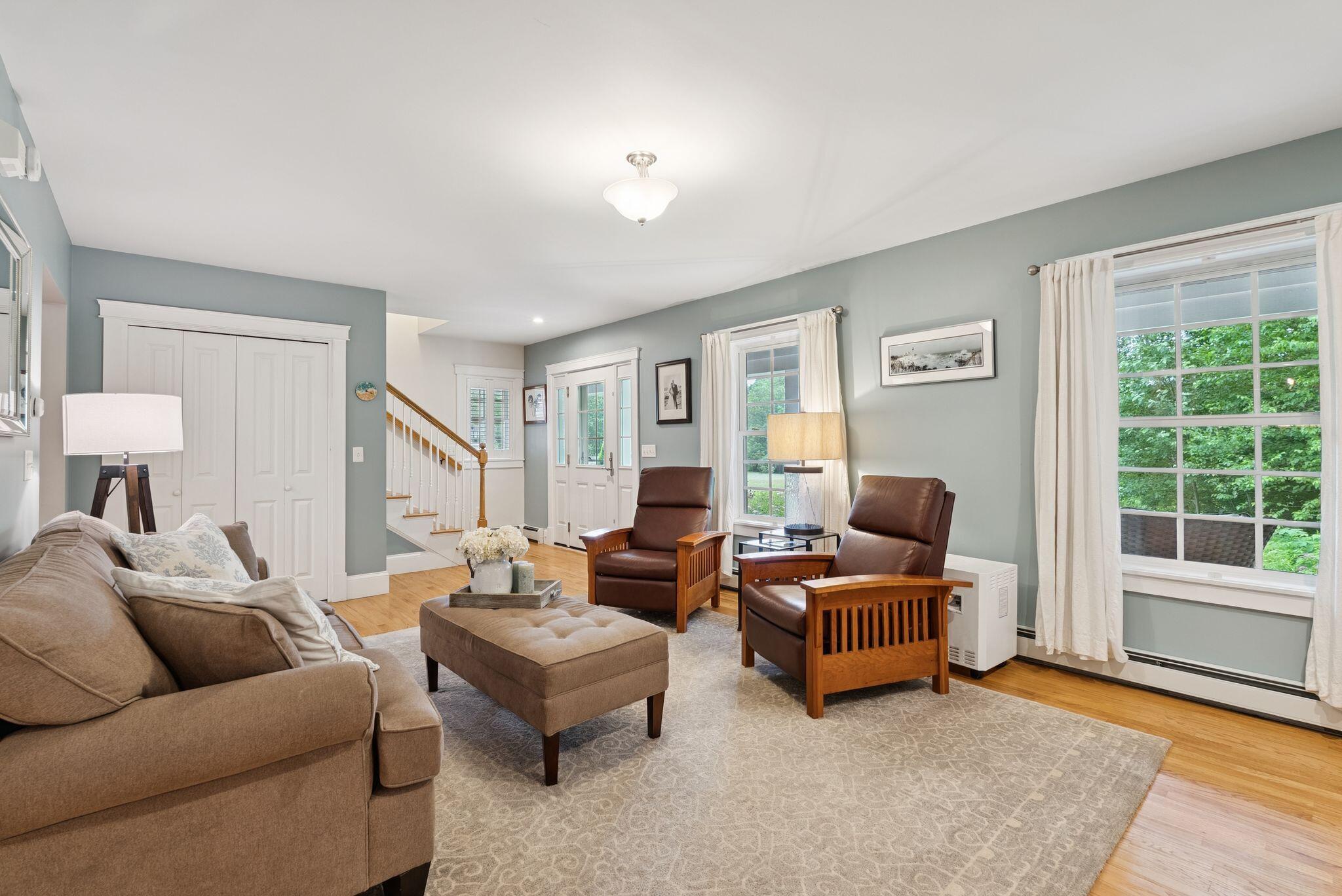 This stunning classic Colonial combines elegance with modern design. Beautifully landscaped grounds and an inviting front porch set the tone for this special home. Located in a quiet, friendly neighborhood, it provides exceptional privacy and ample parking, including three garage spaces, ideal for entertaining or large gatherings. The thoughtfully designed outdoor space features a private back patio, uniquely enclosed by the home and detached garage, creating a cozy, courtyard-like feel. Enter inside through a tiled mudroom with built-in storage, perfect for keeping life organized. The interior is designed with an exciting and versatile floor plan with plenty of room for guests, relaxation, and everyday living. Creating an inviting atmosphere the spacious eat-in kitchen opens into a grand living room with high cathedral ceilings and gleaming hardwood floors. A sunlit dining room with cathedral ceilings, gas fireplace, and wall-to-wall windows floods the space with natural light and provides direct access to the back patio. Convenience abounds with a first-floor laundry room and additional family room with a gas fireplace. The primary suite includes a full bath with double vanity and striking tiled shower, and three additional bedrooms on the second floor there's ample space for family or guests. The finished basement adds even more living space, with a recreation area that's excellent for games or exercise, a bar with seating, built-ins, and a private bedroom with a full bath. Adding to its appeal, the home offers direct access to the scenic Fuller Farm trails right from the back door. Enjoy excellent bird watching, and 2.6 miles of peaceful trails, it's a nature lover's dream. Ideally just 20 minutes from vibrant downtown Portland and only 15 minutes from Maine's renowned public beaches along the Atlantic coast, this home has comfort, style, convenience, and functionality in a beautiful, private setting; it's a must-see!