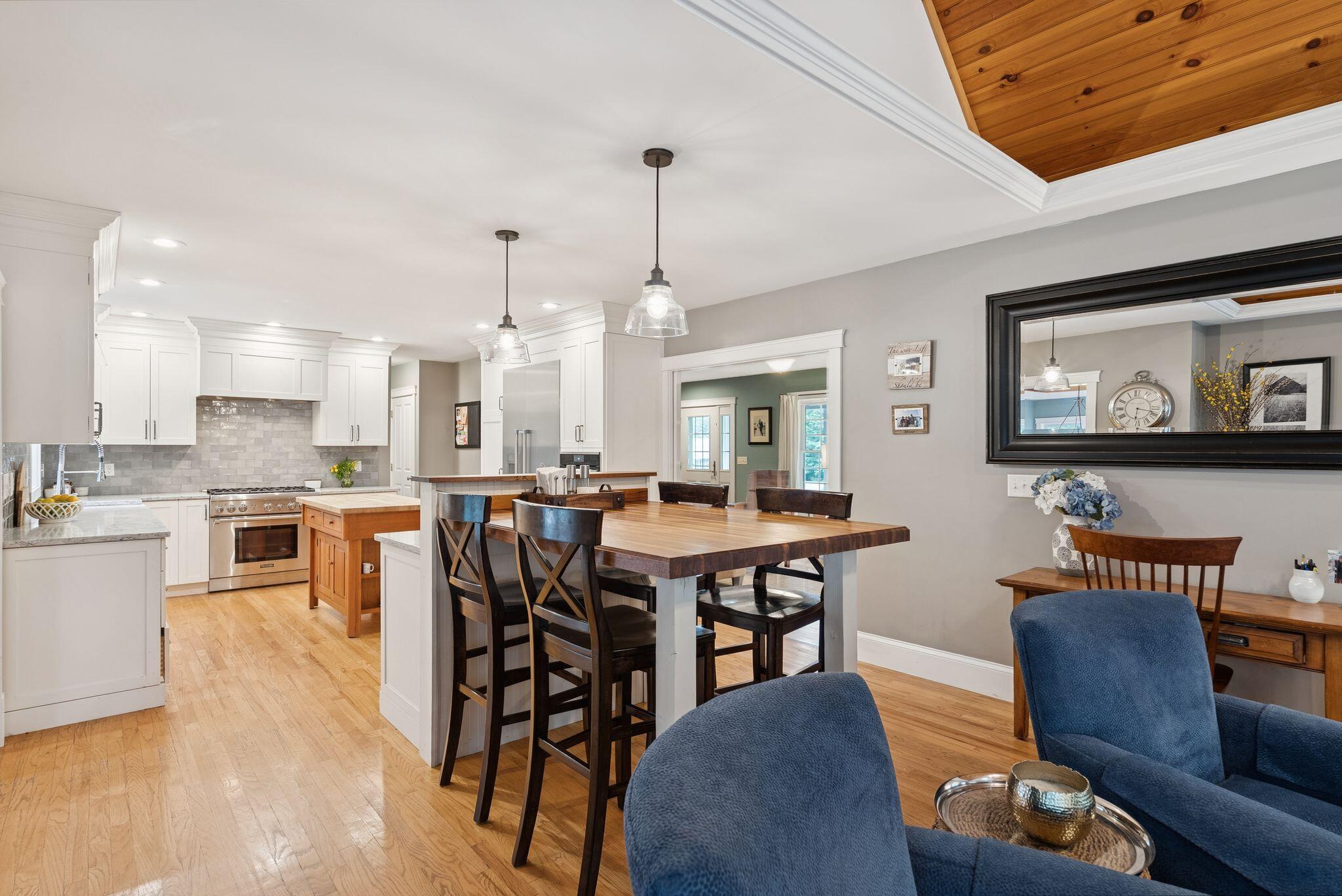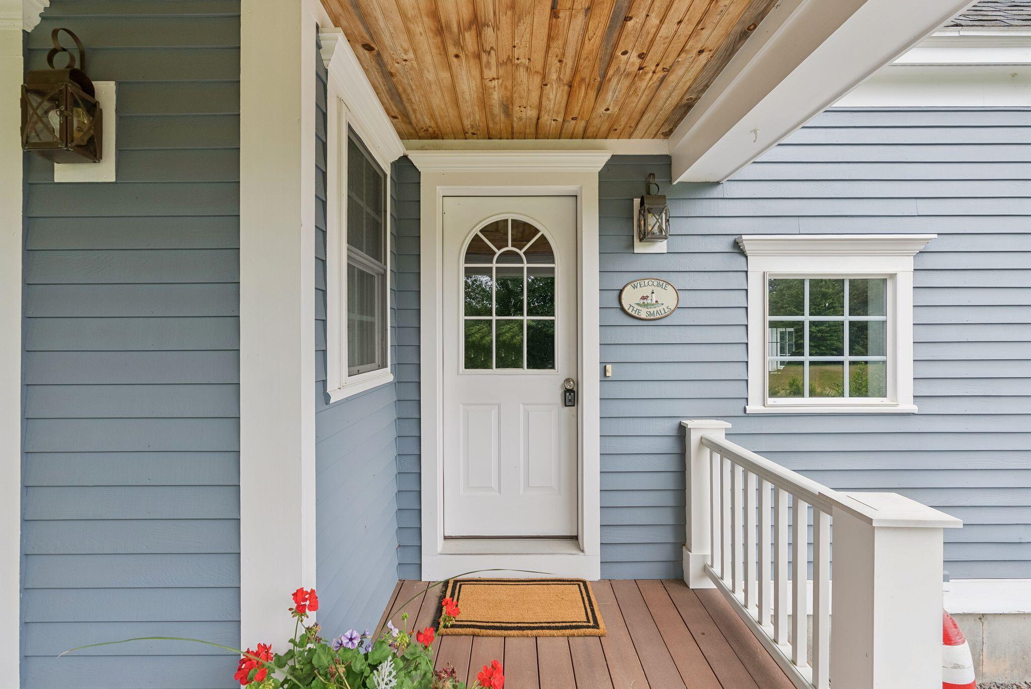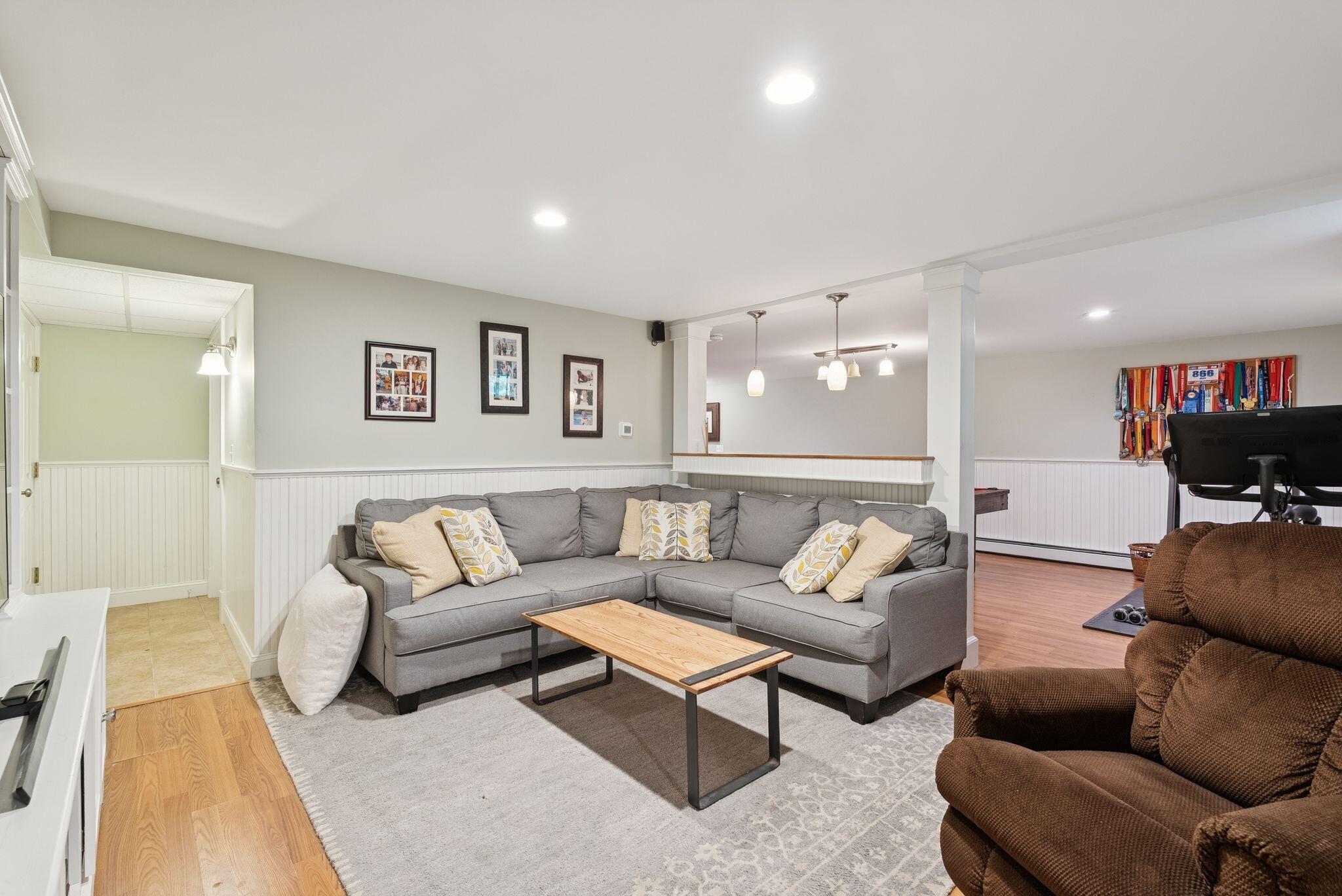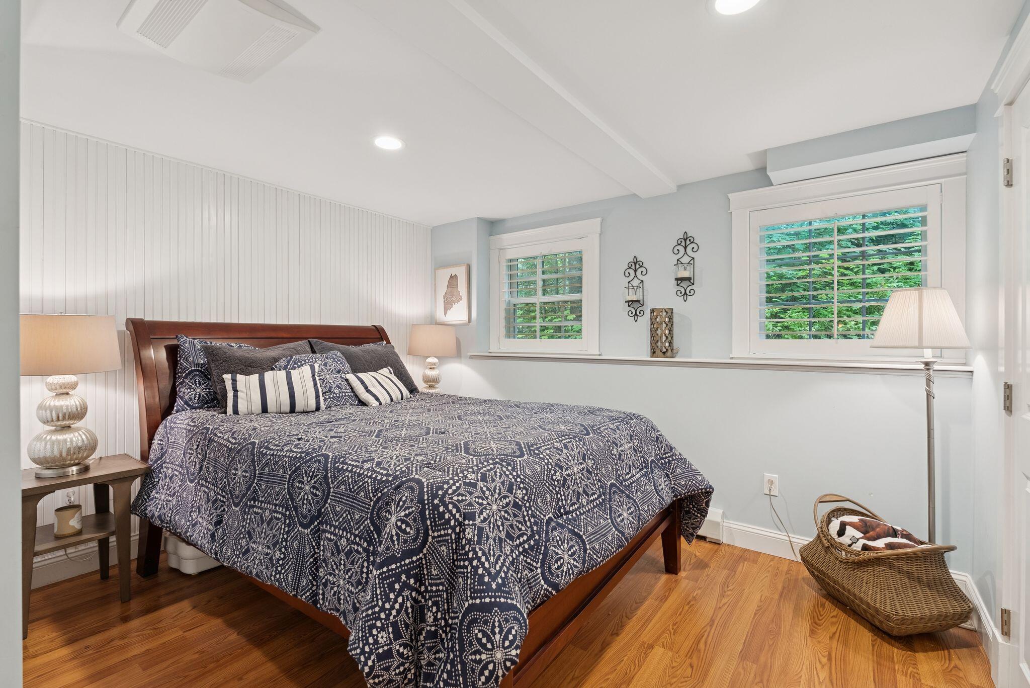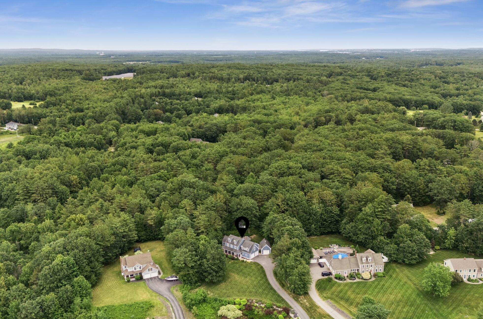 This stunning classic Colonial combines elegance with modern design. Beautifully landscaped grounds and an inviting front porch set the tone for this special home. Located in a quiet, friendly neighborhood, it provides exceptional privacy and ample parking, including three garage spaces, ideal for entertaining or large gatherings. The thoughtfully designed outdoor space features a private back patio, uniquely enclosed by the home and detached garage, creating a cozy, courtyard-like feel. Enter inside through a tiled mudroom with built-in storage, perfect for keeping life organized. The interior is designed with an exciting and versatile floor plan with plenty of room for guests, relaxation, and everyday living. Creating an inviting atmosphere the spacious eat-in kitchen opens into a grand living room with high cathedral ceilings and gleaming hardwood floors. A sunlit dining room with cathedral ceilings, gas fireplace, and wall-to-wall windows floods the space with natural light and provides direct access to the back patio. Convenience abounds with a first-floor laundry room and additional family room with a gas fireplace. The primary suite includes a full bath with double vanity and striking tiled shower, and three additional bedrooms on the second floor there's ample space for family or guests. The finished basement adds even more living space, with a recreation area that's excellent for games or exercise, a bar with seating, built-ins, and a private bedroom with a full bath. Adding to its appeal, the home offers direct access to the scenic Fuller Farm trails right from the back door. Enjoy excellent bird watching, and 2.6 miles of peaceful trails, it's a nature lover's dream. Ideally just 20 minutes from vibrant downtown Portland and only 15 minutes from Maine's renowned public beaches along the Atlantic coast, this home has comfort, style, convenience, and functionality in a beautiful, private setting; it's a must-see!