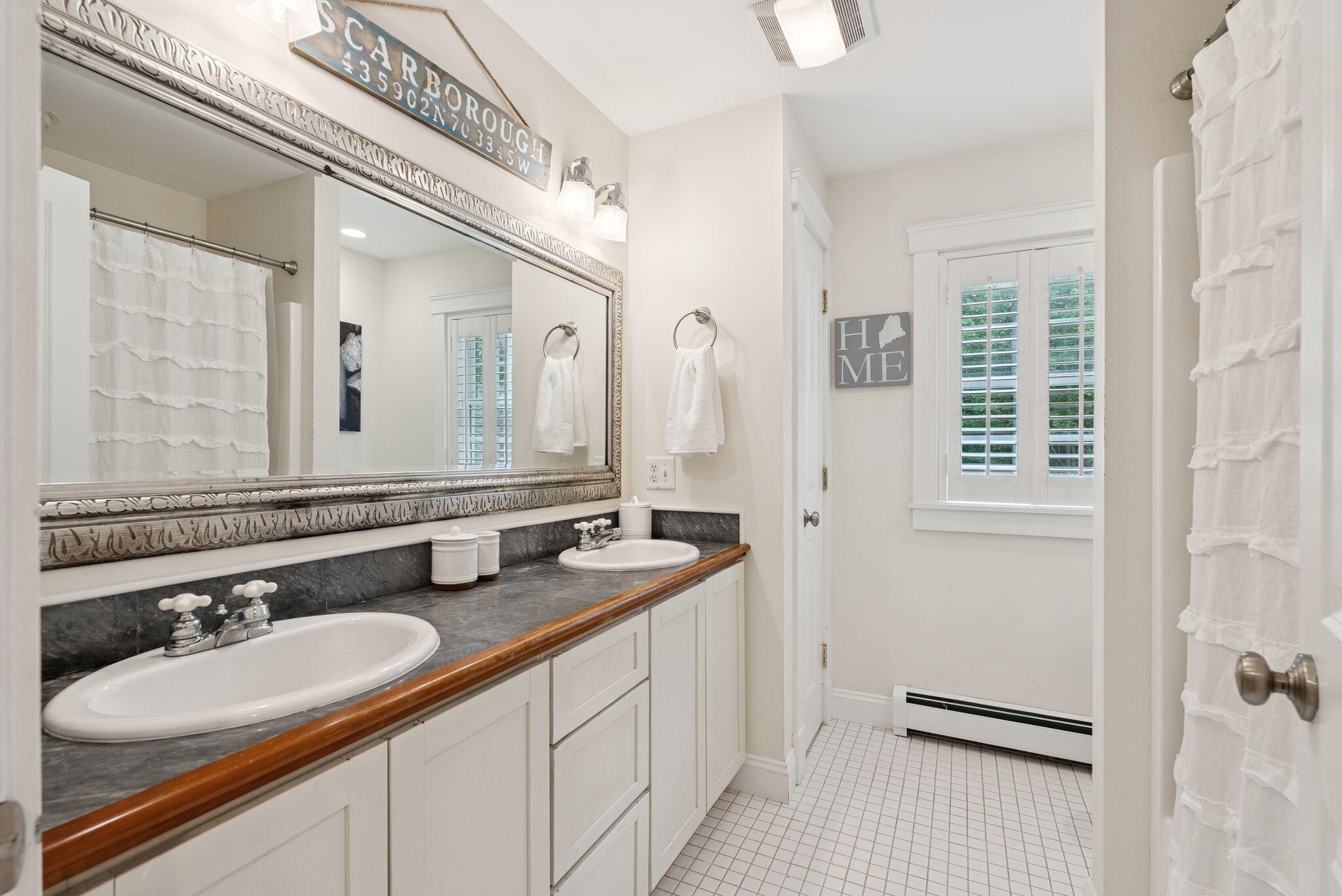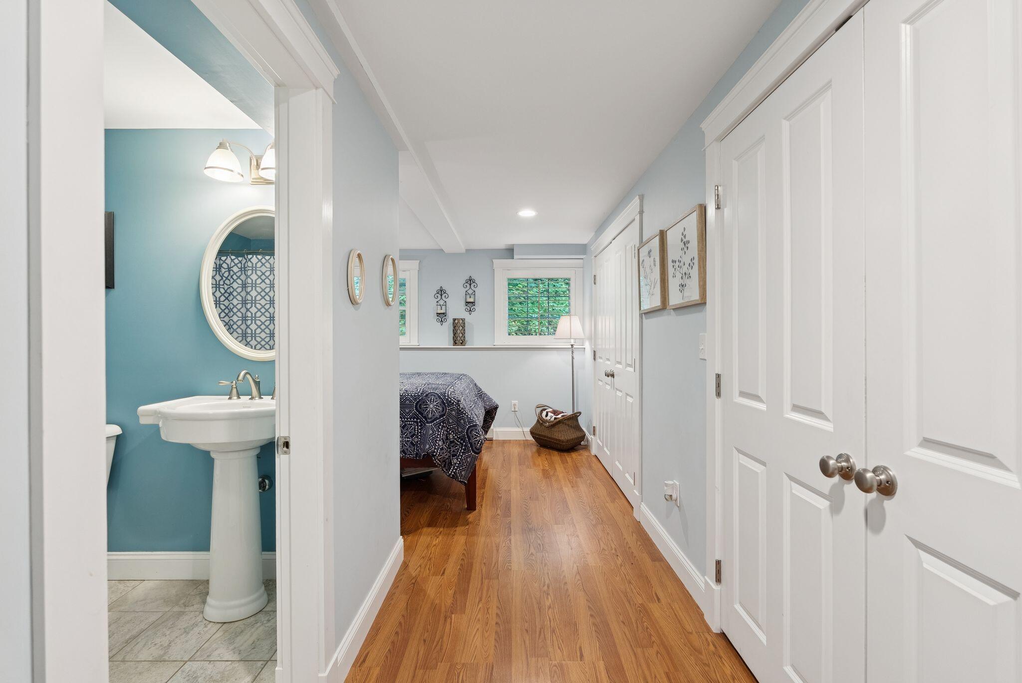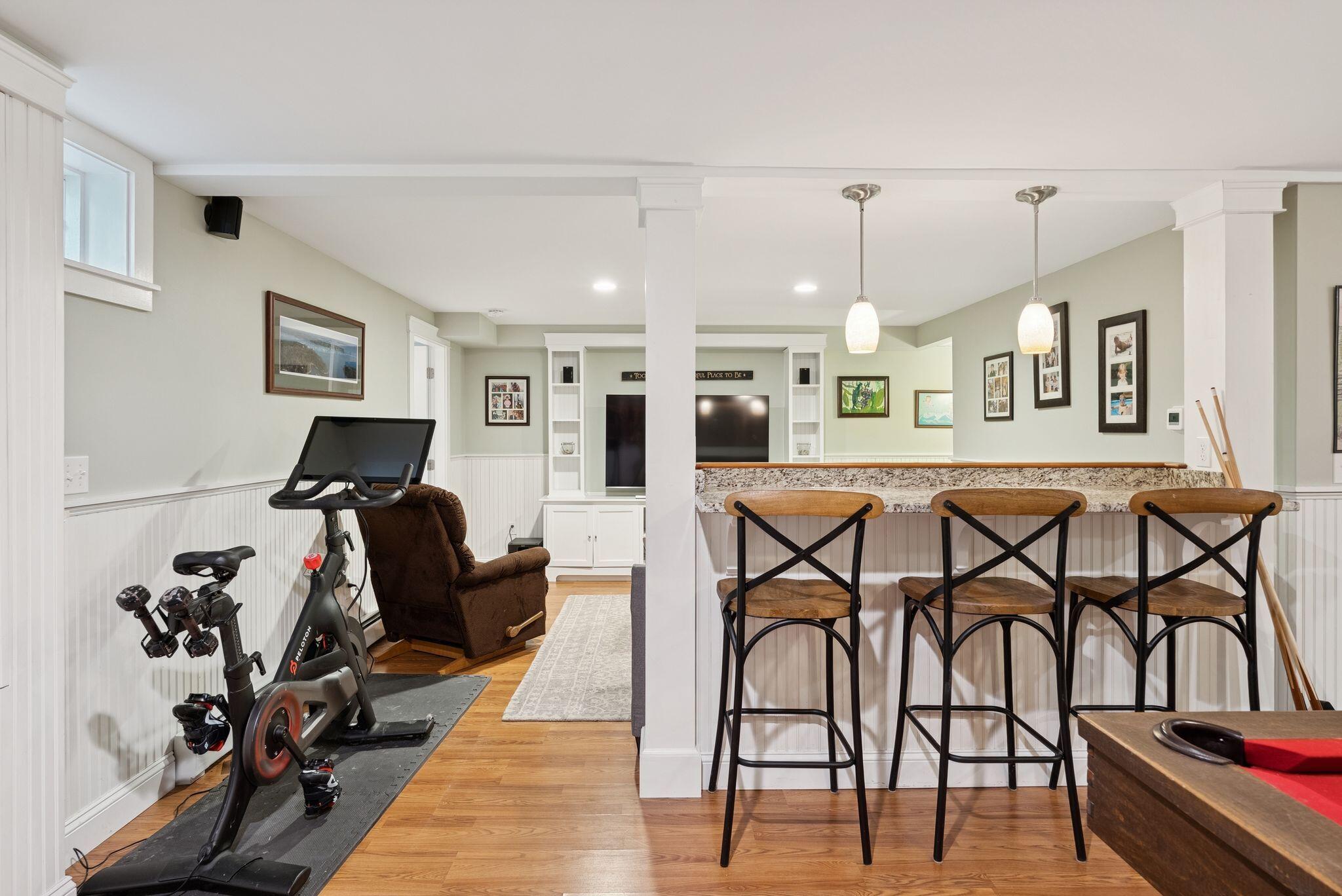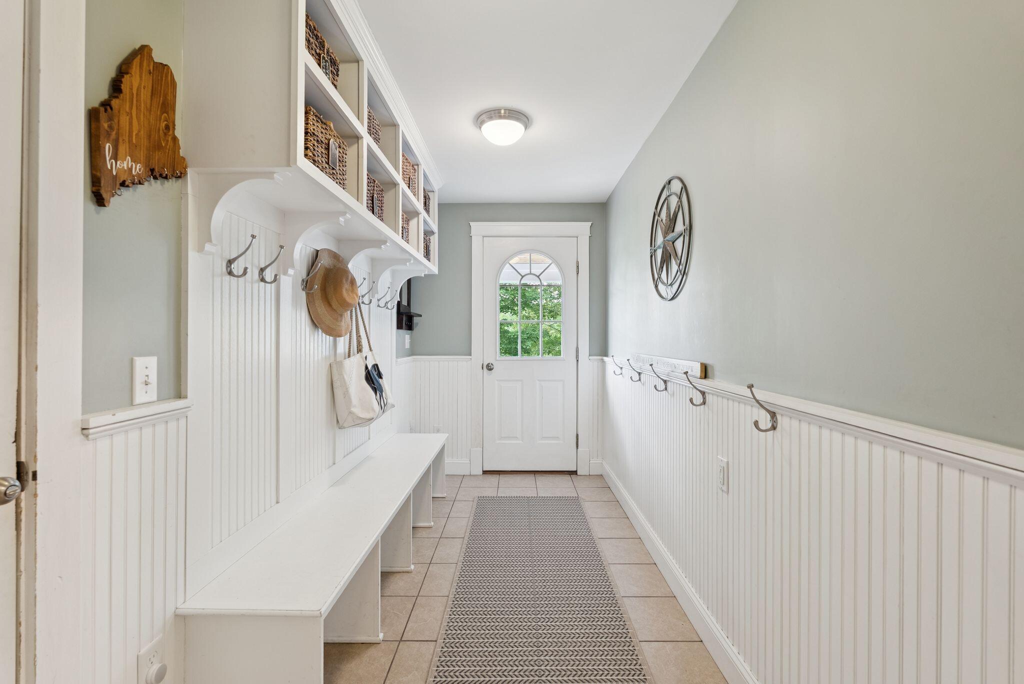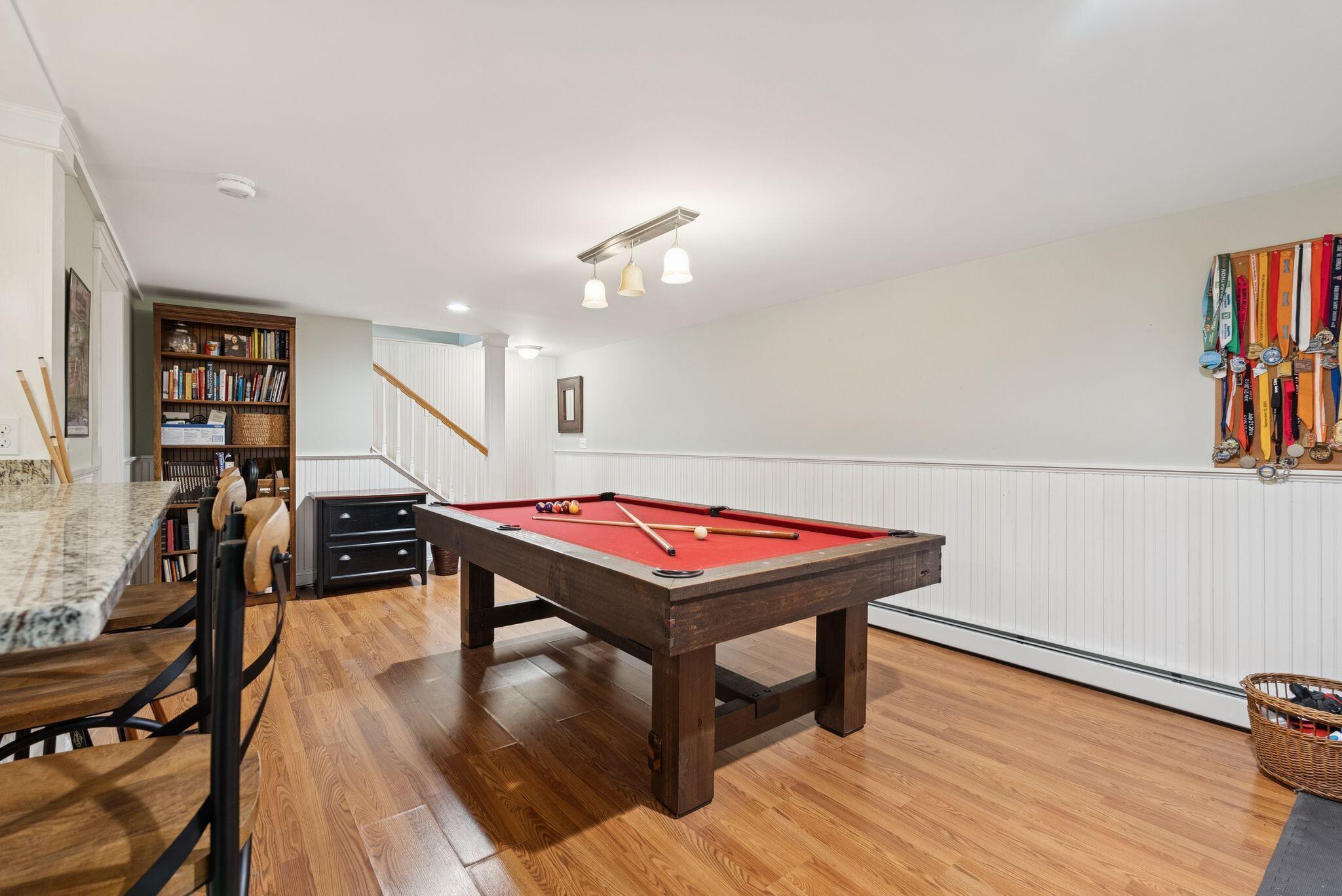 This stunning classic Colonial combines elegance with modern design. Beautifully landscaped grounds and an inviting front porch set the tone for this special home. Located in a quiet, friendly neighborhood, it provides exceptional privacy and ample parking, including three garage spaces, ideal for entertaining or large gatherings. The thoughtfully designed outdoor space features a private back patio, uniquely enclosed by the home and detached garage, creating a cozy, courtyard-like feel. Enter inside through a tiled mudroom with built-in storage, perfect for keeping life organized. The interior is designed with an exciting and versatile floor plan with plenty of room for guests, relaxation, and everyday living. Creating an inviting atmosphere the spacious eat-in kitchen opens into a grand living room with high cathedral ceilings and gleaming hardwood floors. A sunlit dining room with cathedral ceilings, gas fireplace, and wall-to-wall windows floods the space with natural light and provides direct access to the back patio. Convenience abounds with a first-floor laundry room and additional family room with a gas fireplace. The primary suite includes a full bath with double vanity and striking tiled shower, and three additional bedrooms on the second floor there's ample space for family or guests. The finished basement adds even more living space, with a recreation area that's excellent for games or exercise, a bar with seating, built-ins, and a private bedroom with a full bath. Adding to its appeal, the home offers direct access to the scenic Fuller Farm trails right from the back door. Enjoy excellent bird watching, and 2.6 miles of peaceful trails, it's a nature lover's dream. Ideally just 20 minutes from vibrant downtown Portland and only 15 minutes from Maine's renowned public beaches along the Atlantic coast, this home has comfort, style, convenience, and functionality in a beautiful, private setting; it's a must-see!