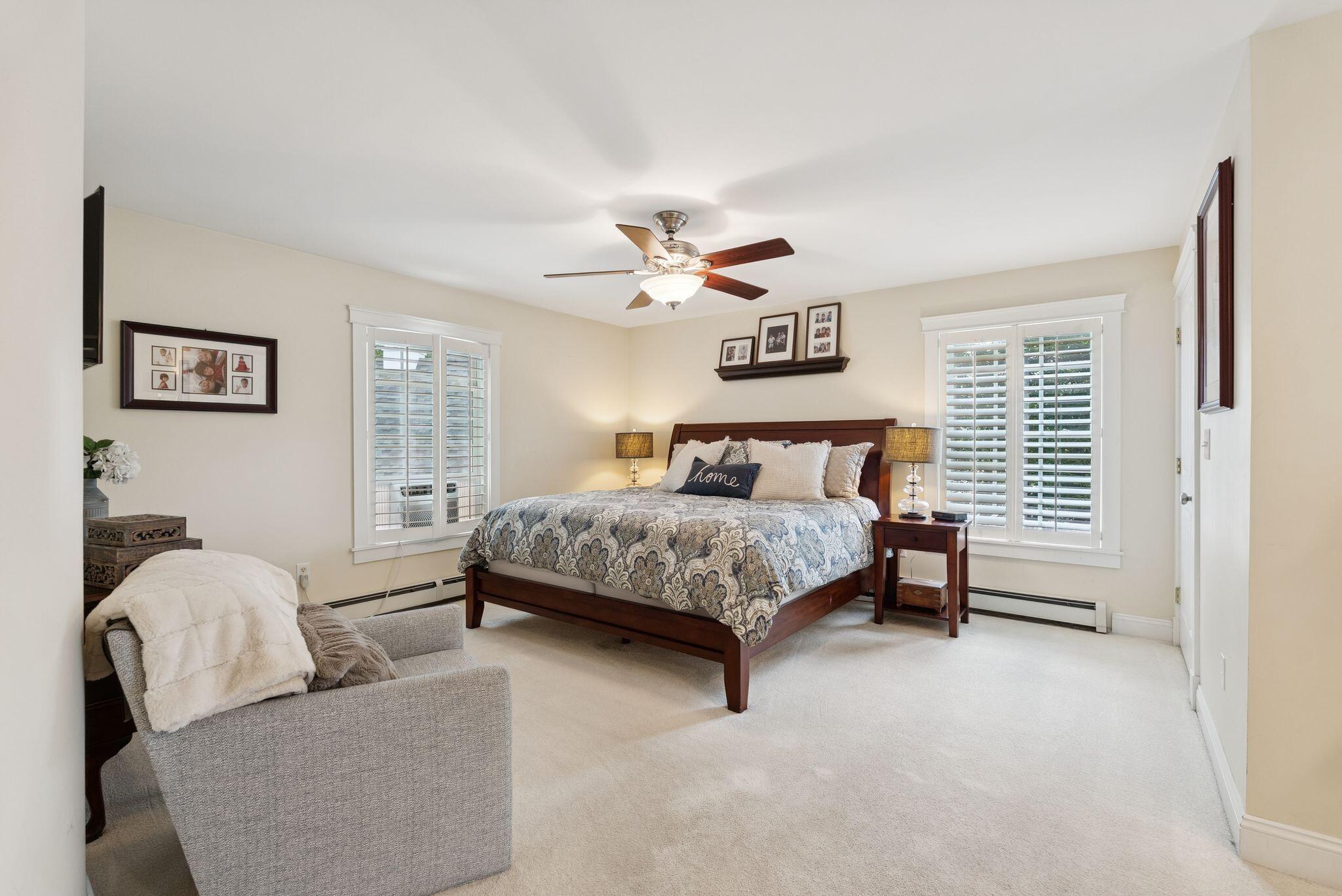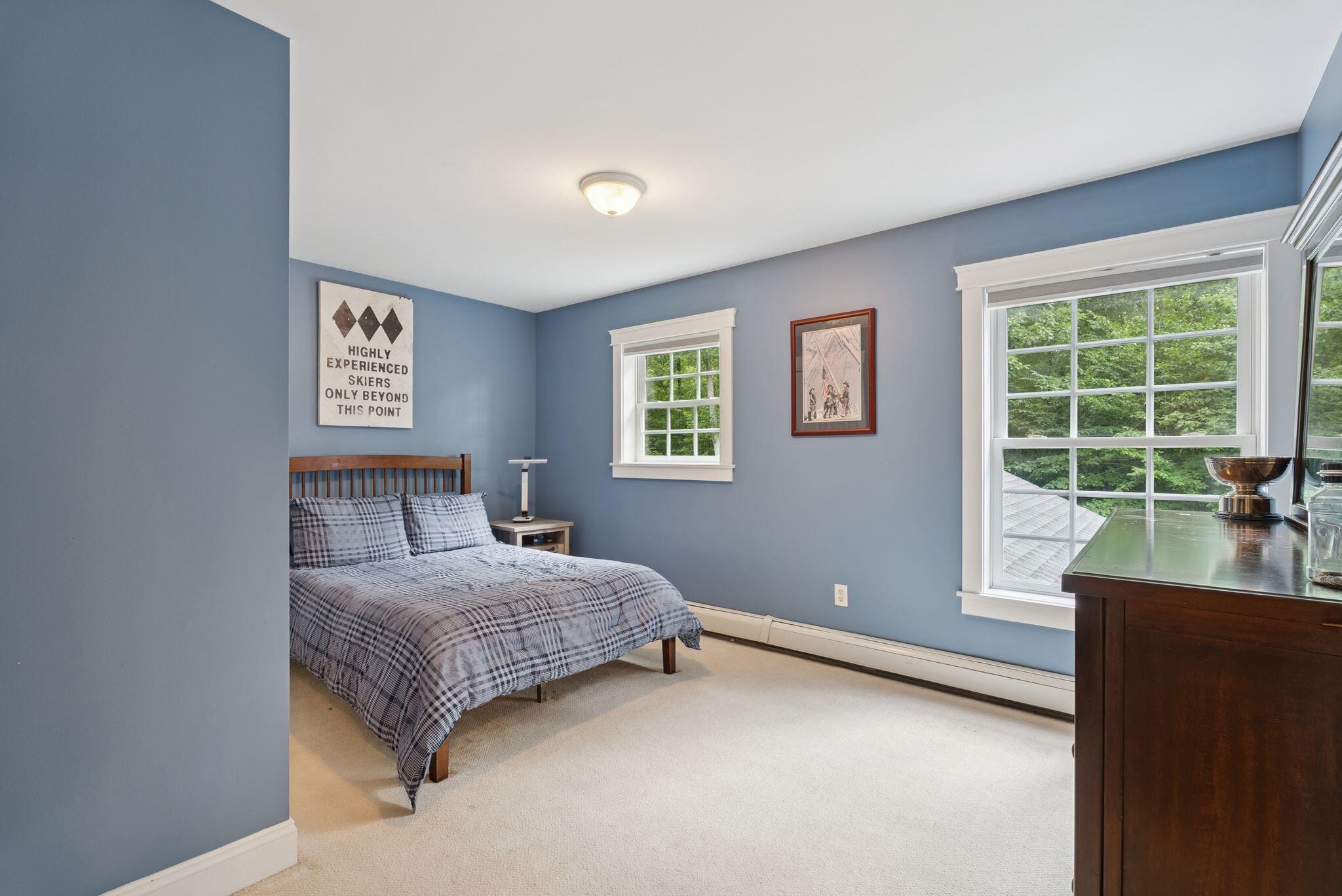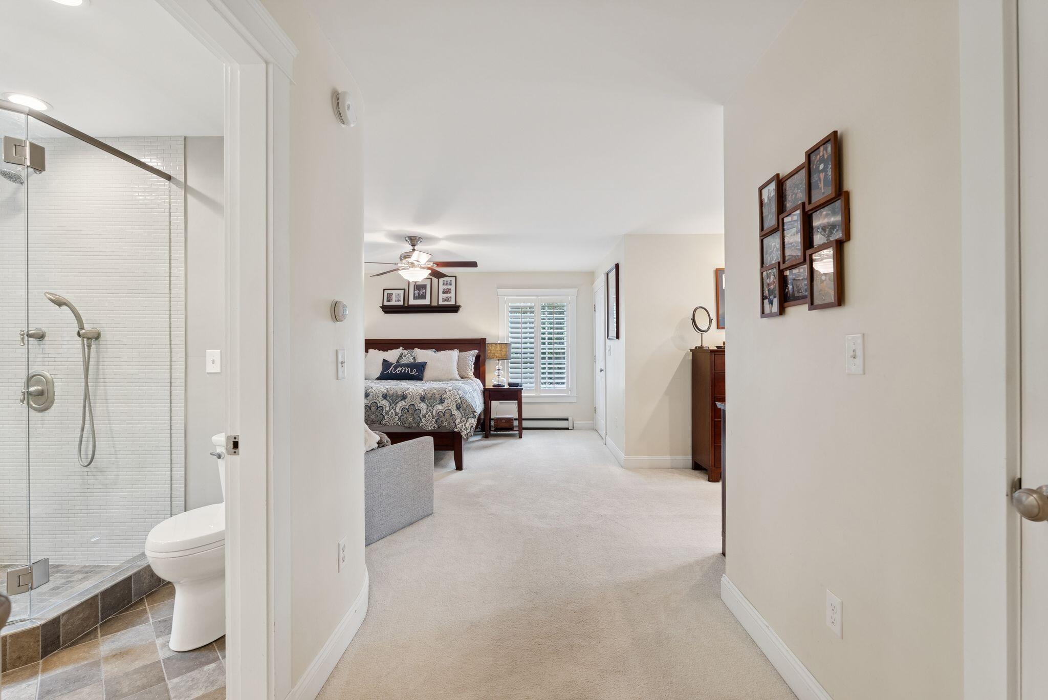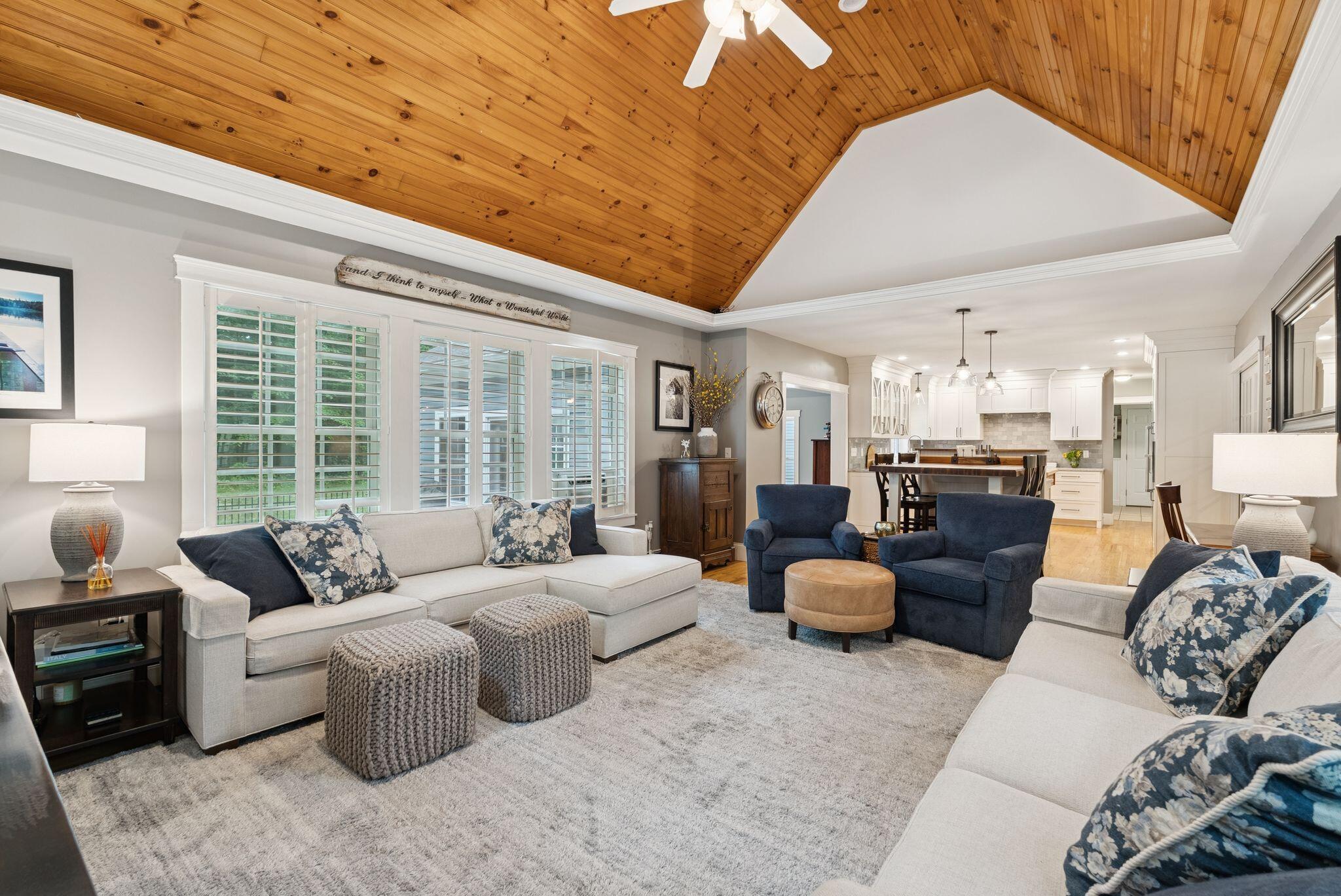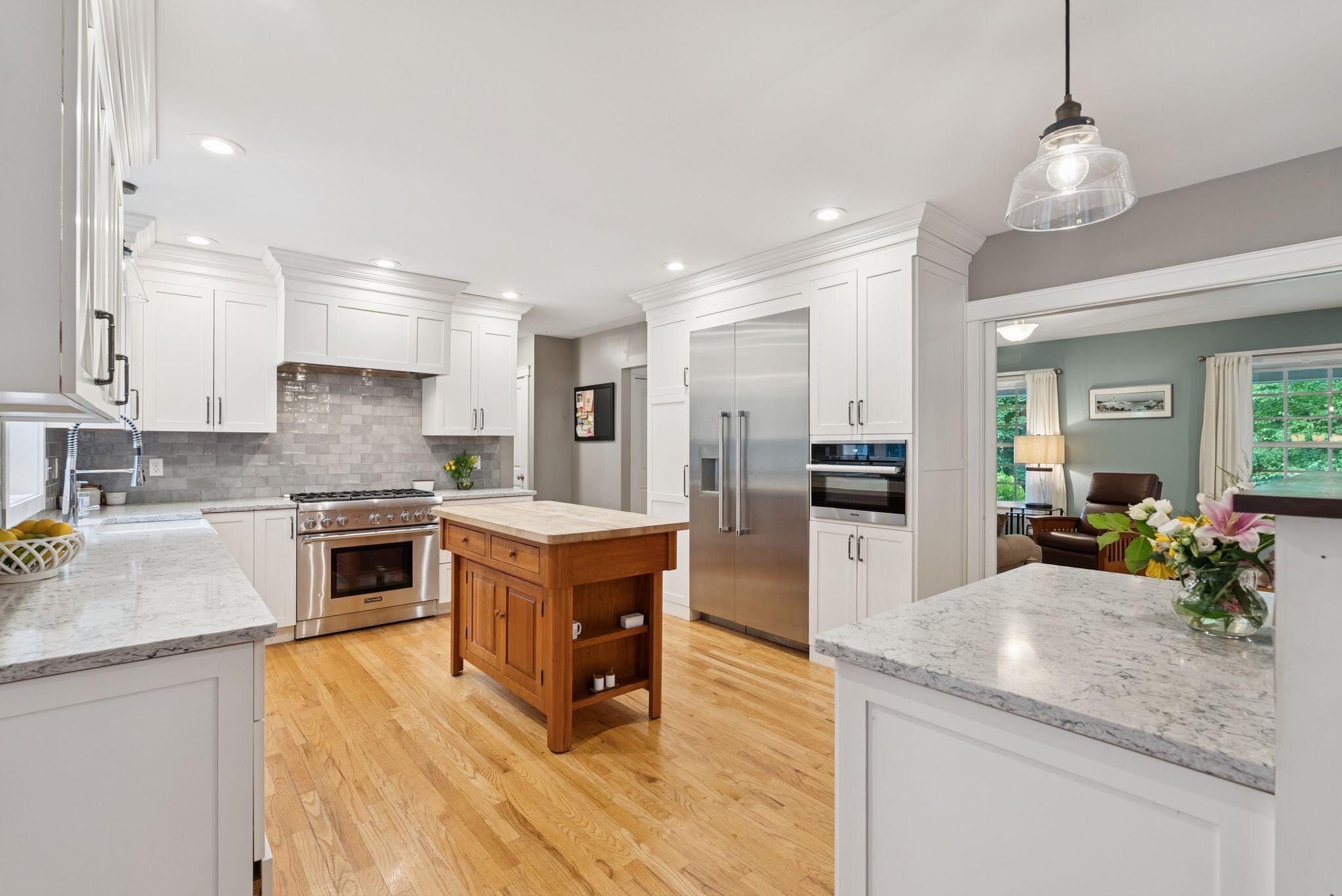 This stunning classic Colonial combines elegance with modern design. Beautifully landscaped grounds and an inviting front porch set the tone for this special home. Located in a quiet, friendly neighborhood, it provides exceptional privacy and ample parking, including three garage spaces, ideal for entertaining or large gatherings. The thoughtfully designed outdoor space features a private back patio, uniquely enclosed by the home and detached garage, creating a cozy, courtyard-like feel. Enter inside through a tiled mudroom with built-in storage, perfect for keeping life organized. The interior is designed with an exciting and versatile floor plan with plenty of room for guests, relaxation, and everyday living. Creating an inviting atmosphere the spacious eat-in kitchen opens into a grand living room with high cathedral ceilings and gleaming hardwood floors. A sunlit dining room with cathedral ceilings, gas fireplace, and wall-to-wall windows floods the space with natural light and provides direct access to the back patio. Convenience abounds with a first-floor laundry room and additional family room with a gas fireplace. The primary suite includes a full bath with double vanity and striking tiled shower, and three additional bedrooms on the second floor there's ample space for family or guests. The finished basement adds even more living space, with a recreation area that's excellent for games or exercise, a bar with seating, built-ins, and a private bedroom with a full bath. Adding to its appeal, the home offers direct access to the scenic Fuller Farm trails right from the back door. Enjoy excellent bird watching, and 2.6 miles of peaceful trails, it's a nature lover's dream. Ideally just 20 minutes from vibrant downtown Portland and only 15 minutes from Maine's renowned public beaches along the Atlantic coast, this home has comfort, style, convenience, and functionality in a beautiful, private setting; it's a must-see!