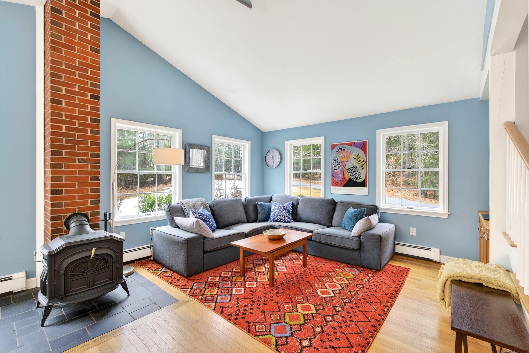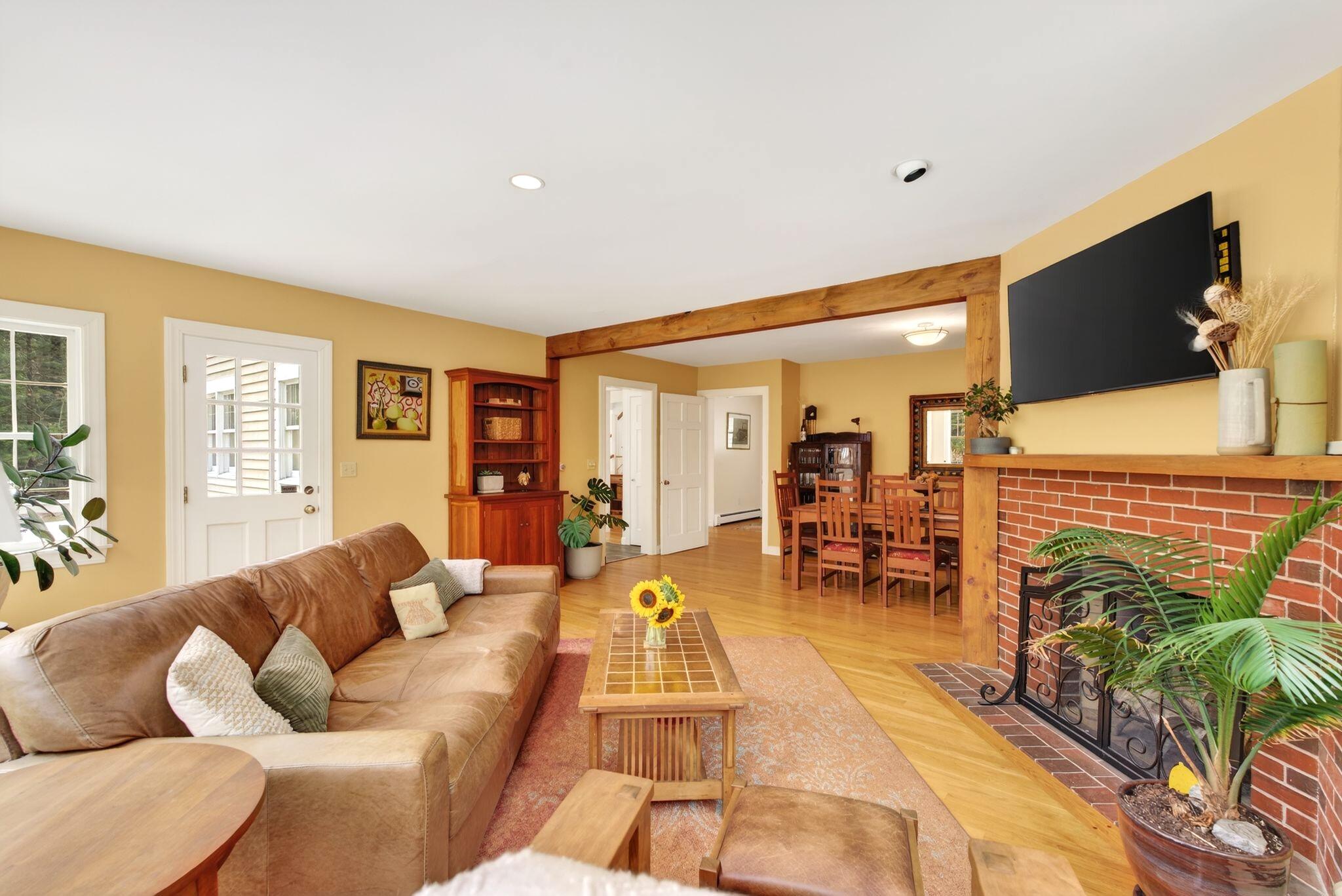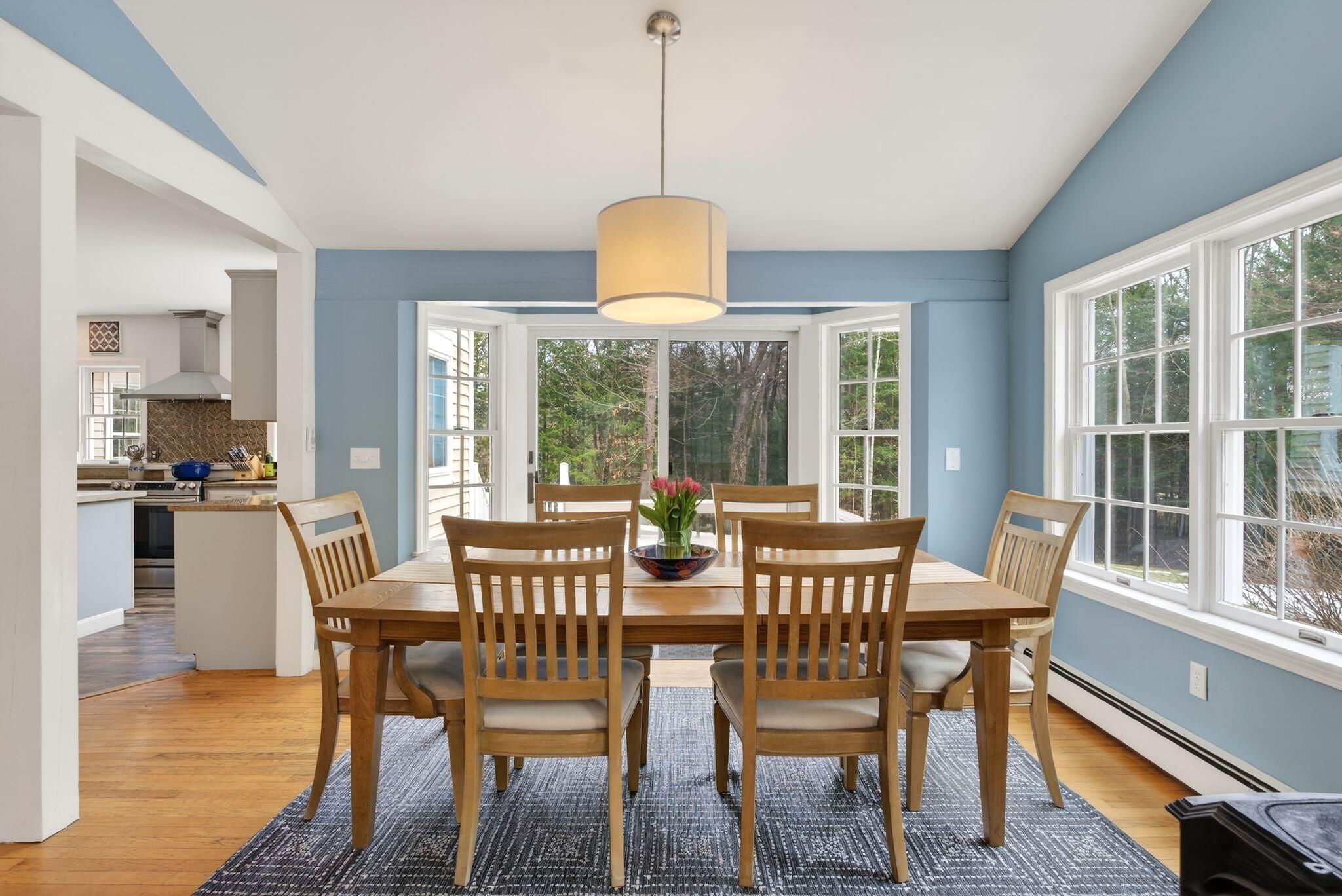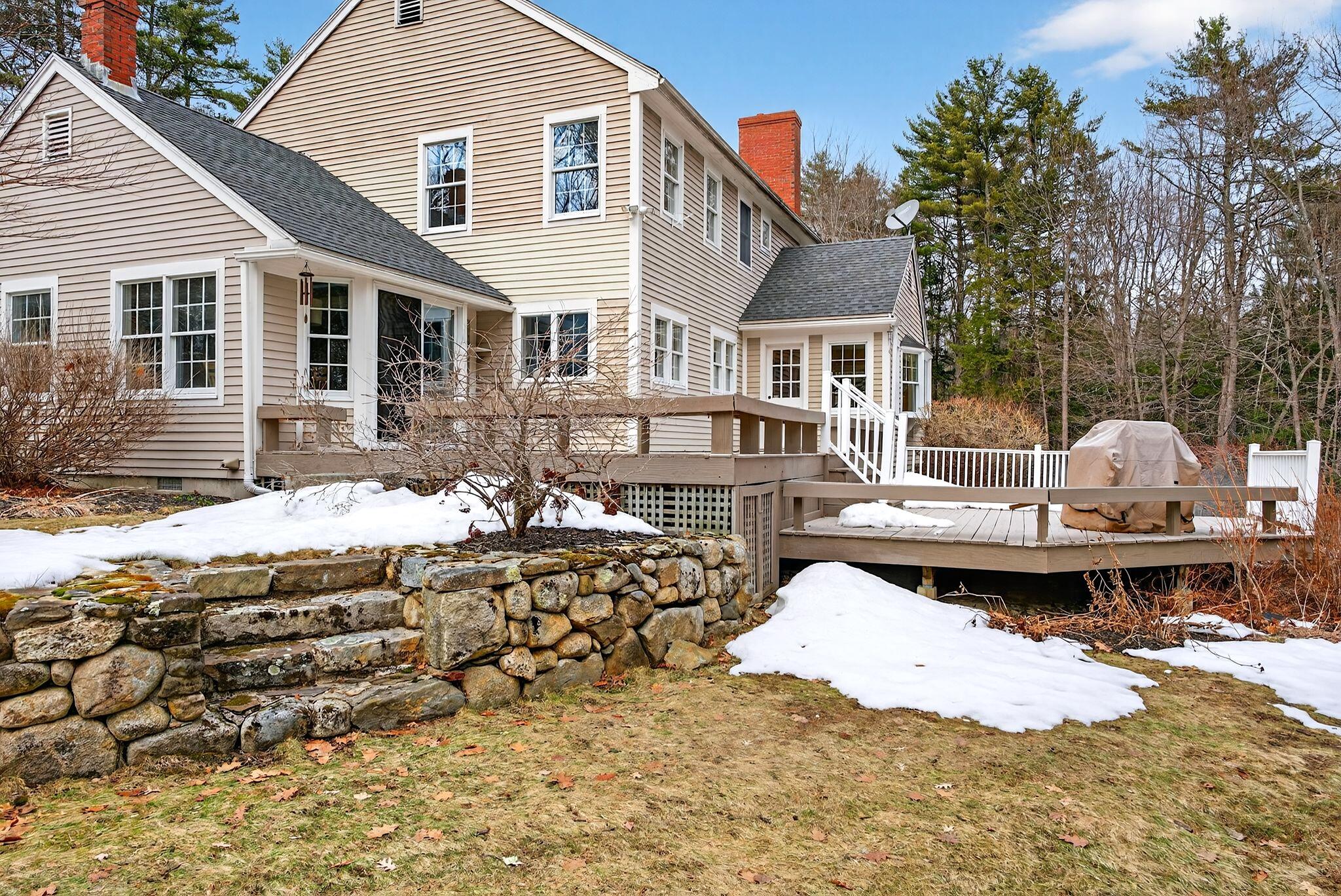 Surrounded by three acres of natural landscape and nearby conservation land, the home provides a sense of seclusion while remaining closely connected to its surroundings. Inside, an expanded layout reveals four bedrooms, two living areas, and dual dining spaces, complemented by three full baths and one half bath, well suited for both everyday enjoyment and memorable annual gatherings. The kitchen anchors the home with granite surfaces, a central island, and two adjoining dining areas on either side. From here, one direction opens to a bright, vaulted living room warmed by a centrally placed wood stove, where sliding doors extend the living space onto a tiered deck overlooking the backyard. A separate family room, centered around a wood-burning fireplace, invites quiet evenings and relaxed gatherings alike with its warm and comforting atmosphere. All bedrooms are thoughtfully arranged in a unique layout on the second level, while additional spaces, including an office and bonus room, offer flexibility for work, creativity, or a quiet space to read. Four garage bays complete the property, an uncommon feature that enhances both practicality and potential. This is a great center point location between Portland's coastline and Sebago Lake, the home offers a refined balance of accessibility and a rural neighborhood to return to.