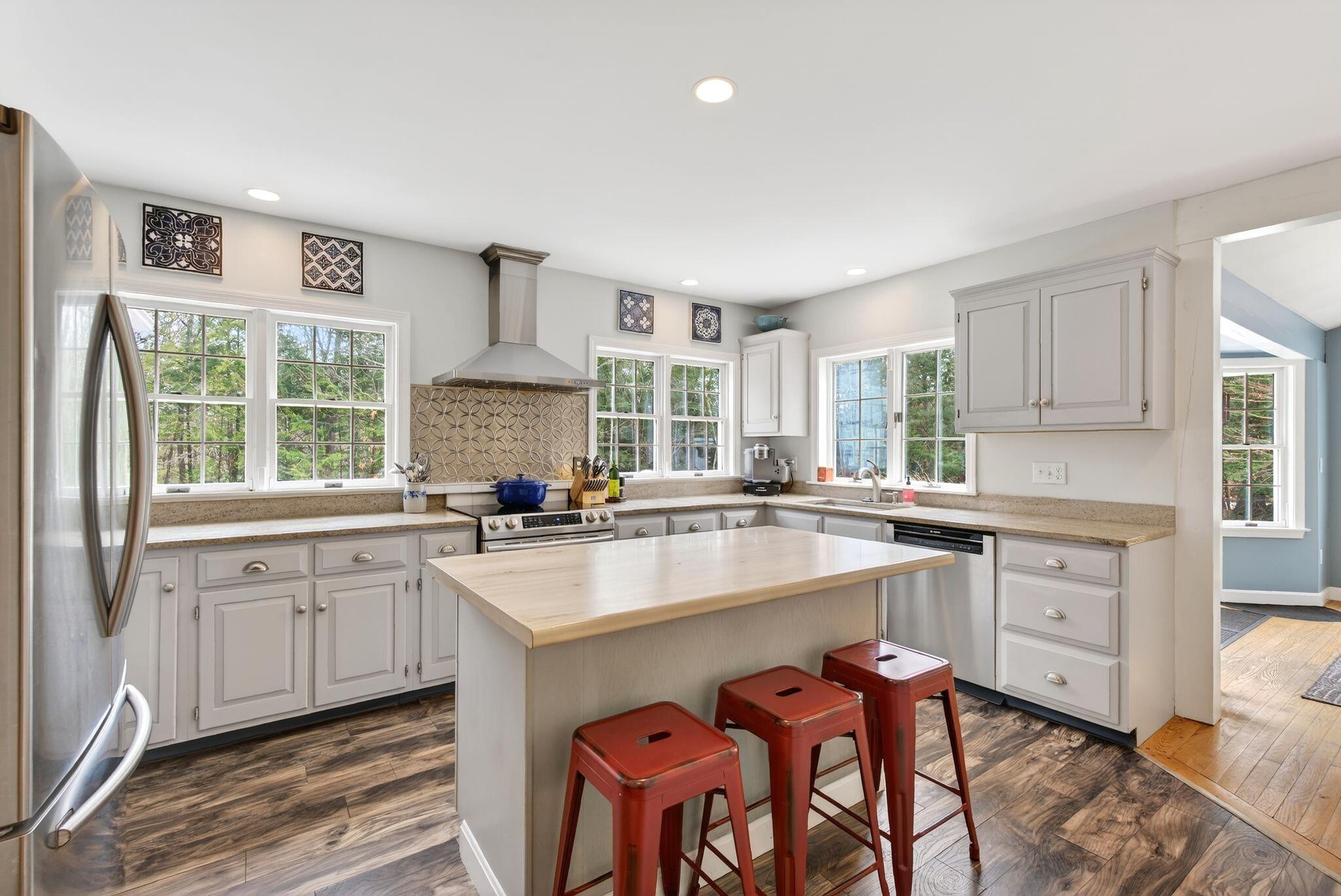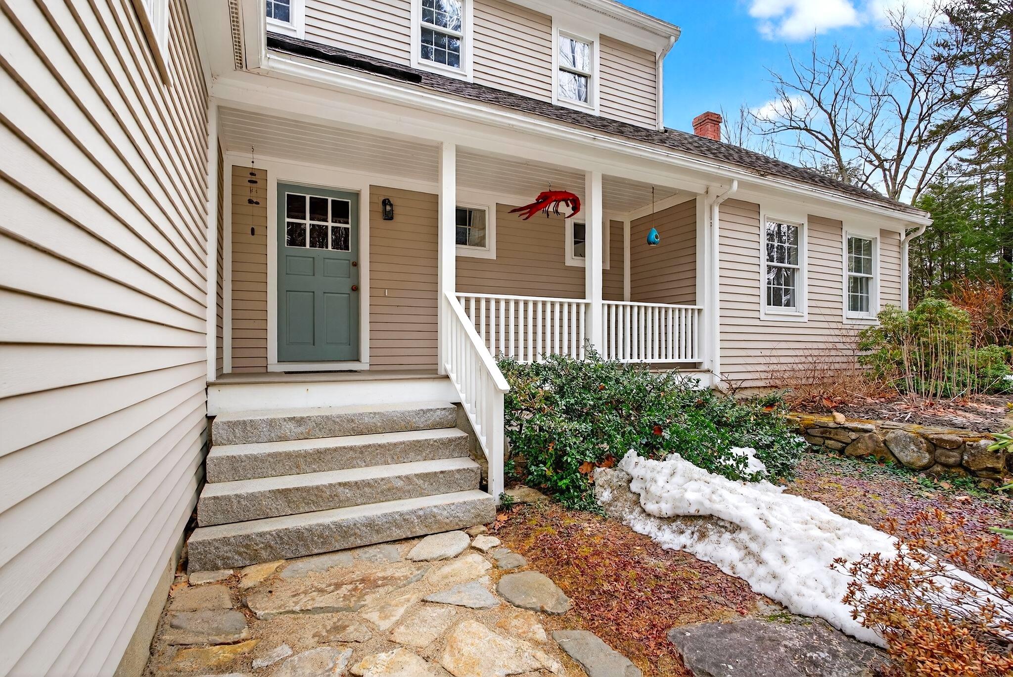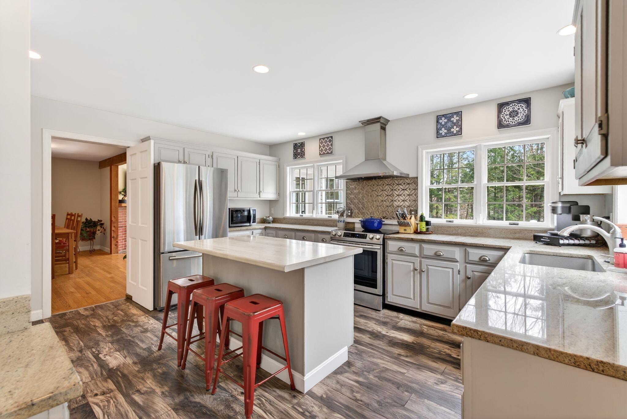 Surrounded by three acres of natural landscape and nearby conservation land, the home provides a sense of seclusion while remaining closely connected to its surroundings. Inside, an expanded layout reveals four bedrooms, two living areas, and dual dining spaces, complemented by three full baths and one half bath, well suited for both everyday enjoyment and memorable annual gatherings. The kitchen anchors the home with granite surfaces, a central island, and two adjoining dining areas on either side. From here, one direction opens to a bright, vaulted living room warmed by a centrally placed wood stove, where sliding doors extend the living space onto a tiered deck overlooking the backyard. A separate family room, centered around a wood-burning fireplace, invites quiet evenings and relaxed gatherings alike with its warm and comforting atmosphere. All bedrooms are thoughtfully arranged in a unique layout on the second level, while additional spaces, including an office and bonus room, offer flexibility for work, creativity, or a quiet space to read. Four garage bays complete the property, an uncommon feature that enhances both practicality and potential. This is a great center point location between Portland's coastline and Sebago Lake, the home offers a refined balance of accessibility and a rural neighborhood to return to.