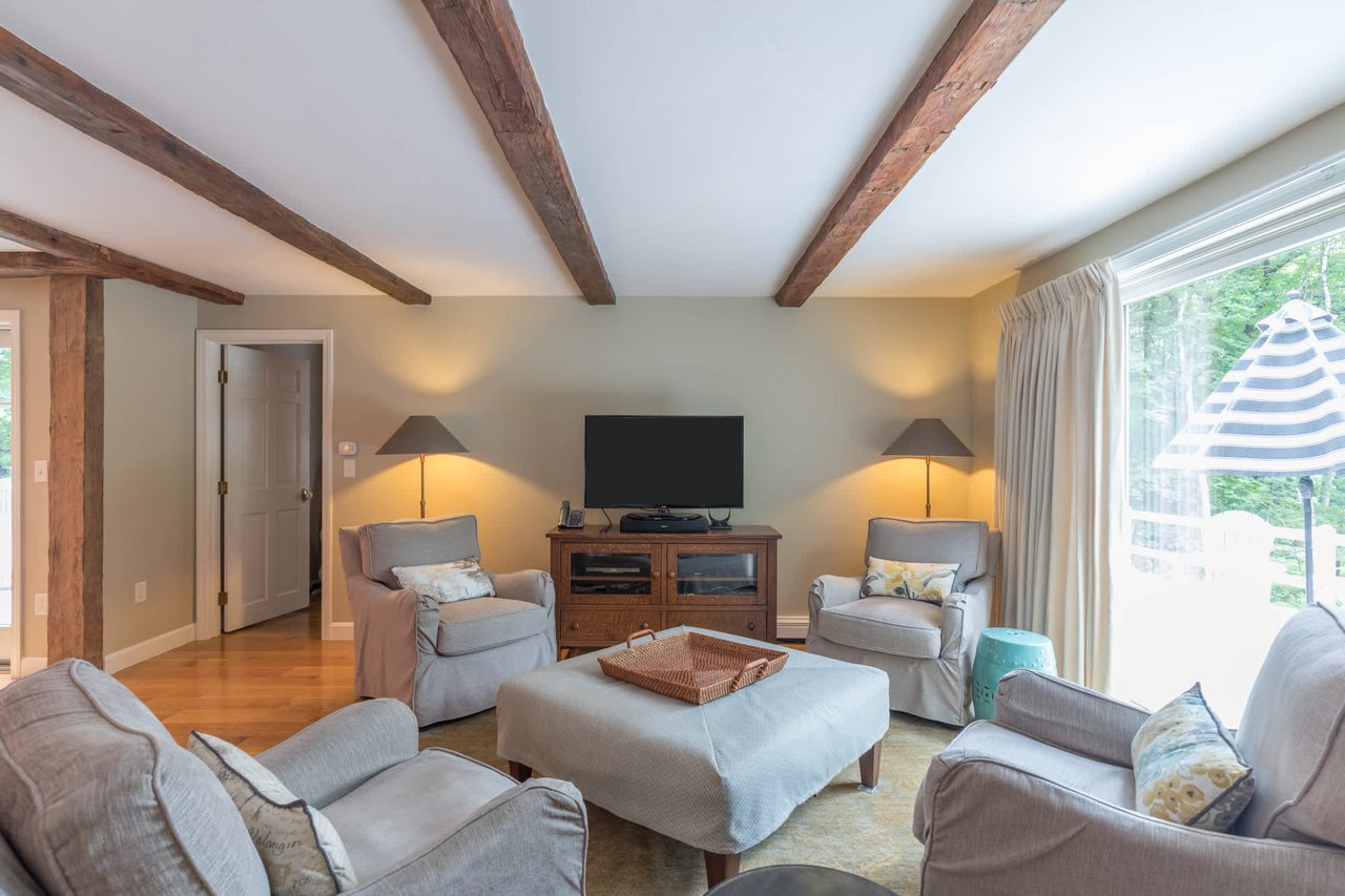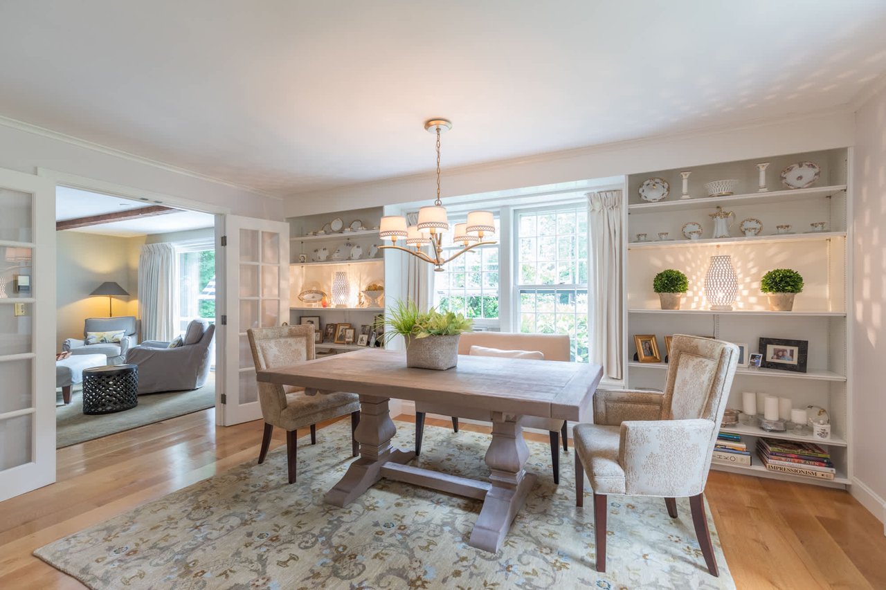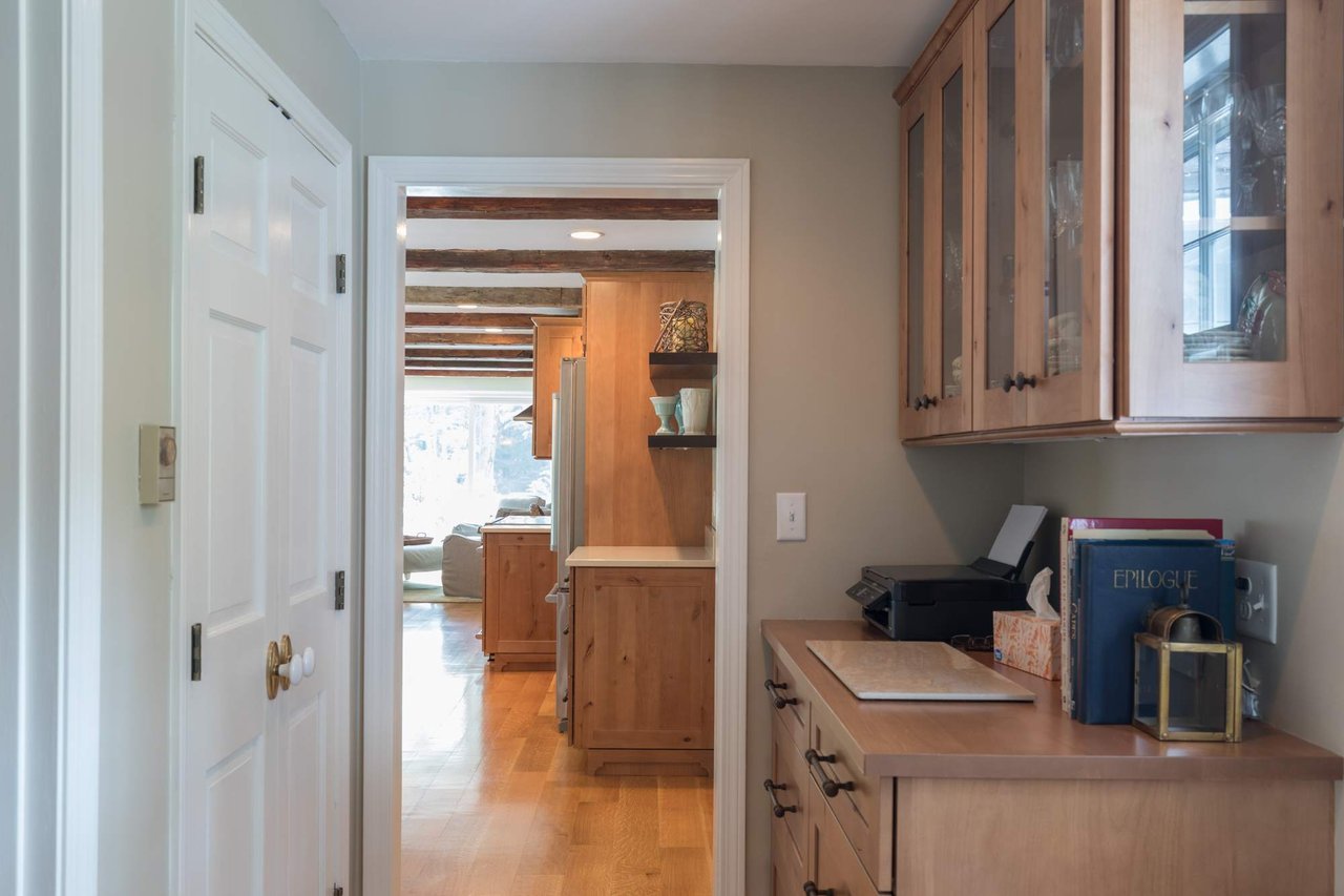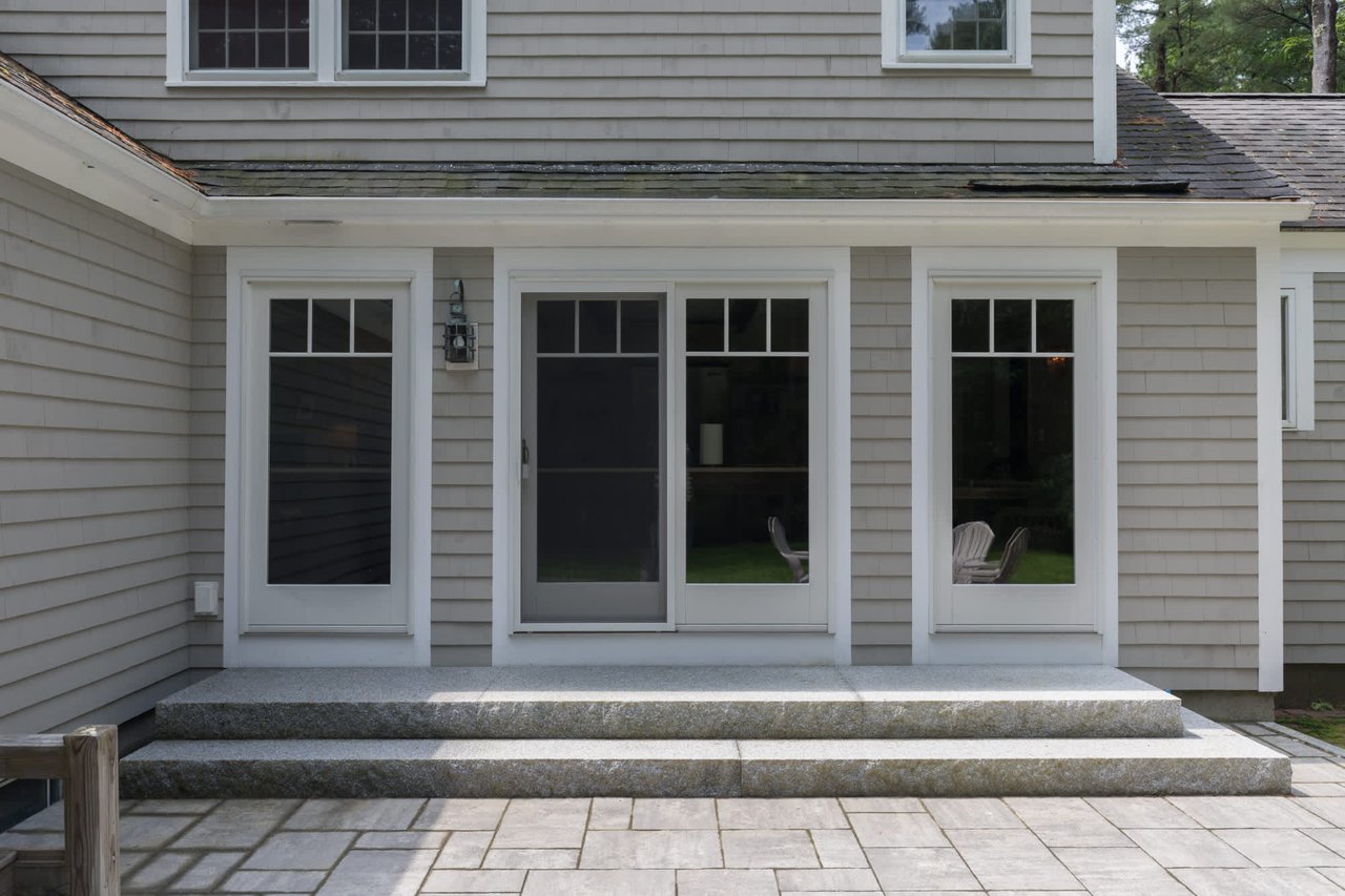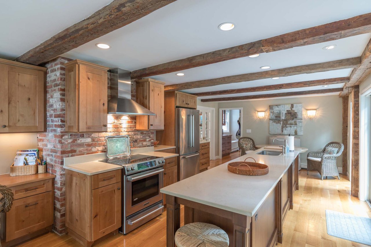 Tucked beneath the tall pines on Cumberland Foreside this timeless Cape Cod style home offers deeded access to Casco Bay and open concept living with hardwood floors throughout. Inside you will find a beautifully renovated eat-in kitchen by M.R. Brewer featuring a spacious island, charming exposed brick and French doors to the stone patio, a living room with built-ins and gas fireplace. This home offers easy one level living with a lovely master suite with custom built-ins and a full bath.