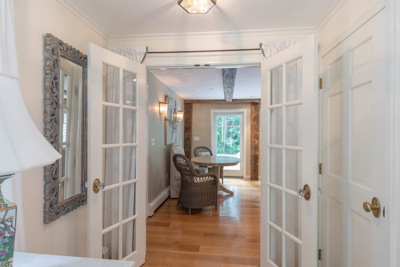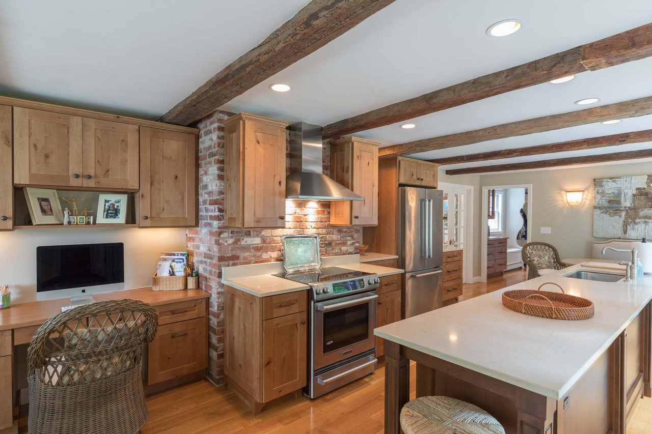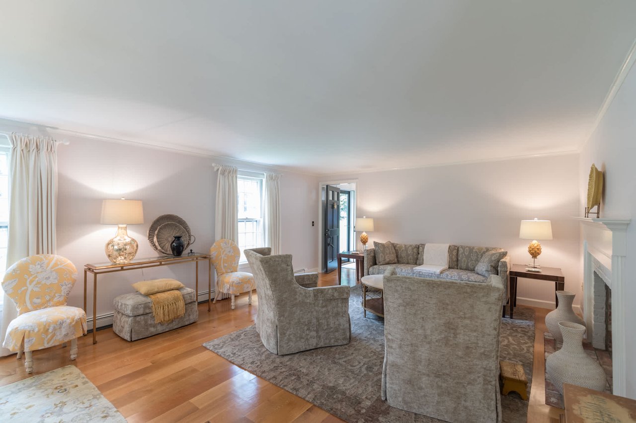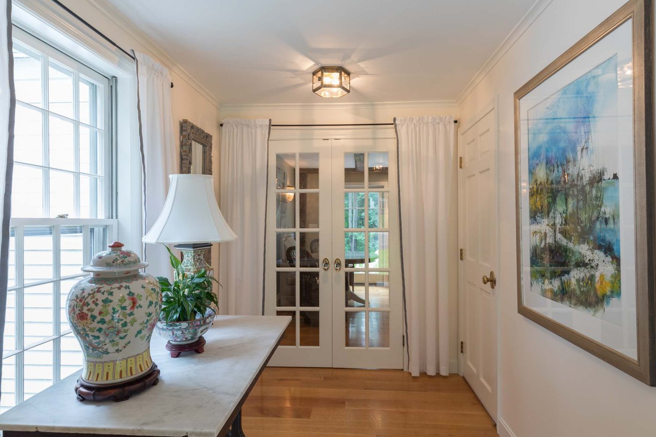 Tucked beneath the tall pines on Cumberland Foreside this timeless Cape Cod style home offers deeded access to Casco Bay and open concept living with hardwood floors throughout. Inside you will find a beautifully renovated eat-in kitchen by M.R. Brewer featuring a spacious island, charming exposed brick and French doors to the stone patio, a living room with built-ins and gas fireplace. This home offers easy one level living with a lovely master suite with custom built-ins and a full bath.